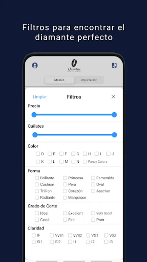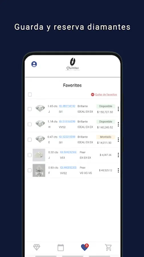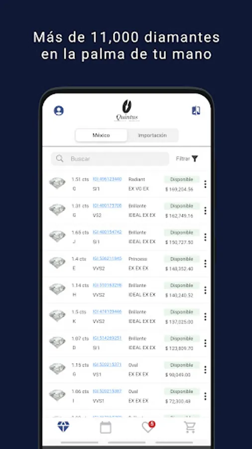 You will have an exclusive inventory for wholesalers of more than 11,000 diamonds in the palm of your hand. A filtering system that will help you quickly find the diamond with the characteristics you are looking for, a 360 video of it and its certificate.