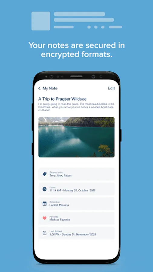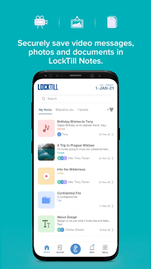 Make your LockTil account today and create protected notes with ease. Have your own private notepad and add text secure notes, audio notes, video notes, photo notes, memories, important documents in your LockTill App. Additionally, keep a lock diary journal for any day you want. Then secure notes with password, pin, 2-factor identification and have peace of mind that no one will be able to view them until you decide to share them.