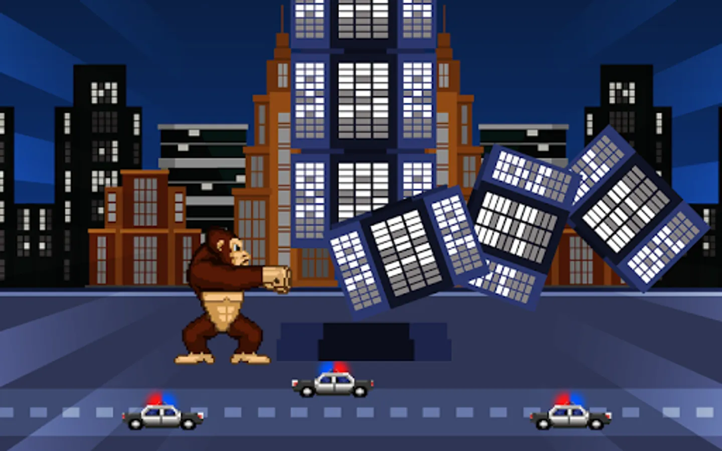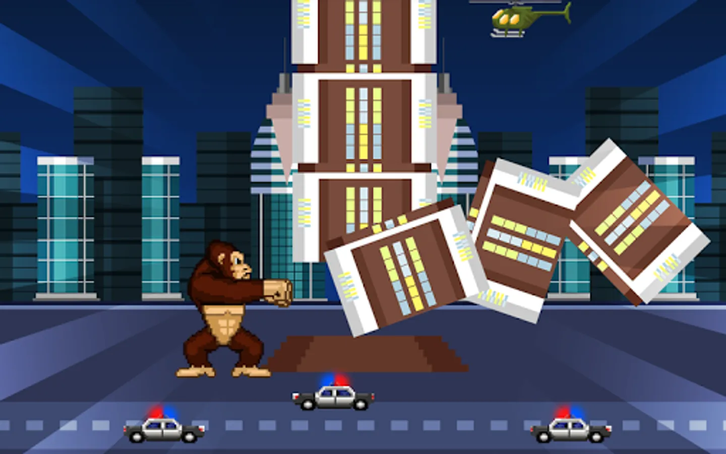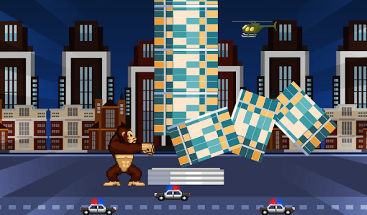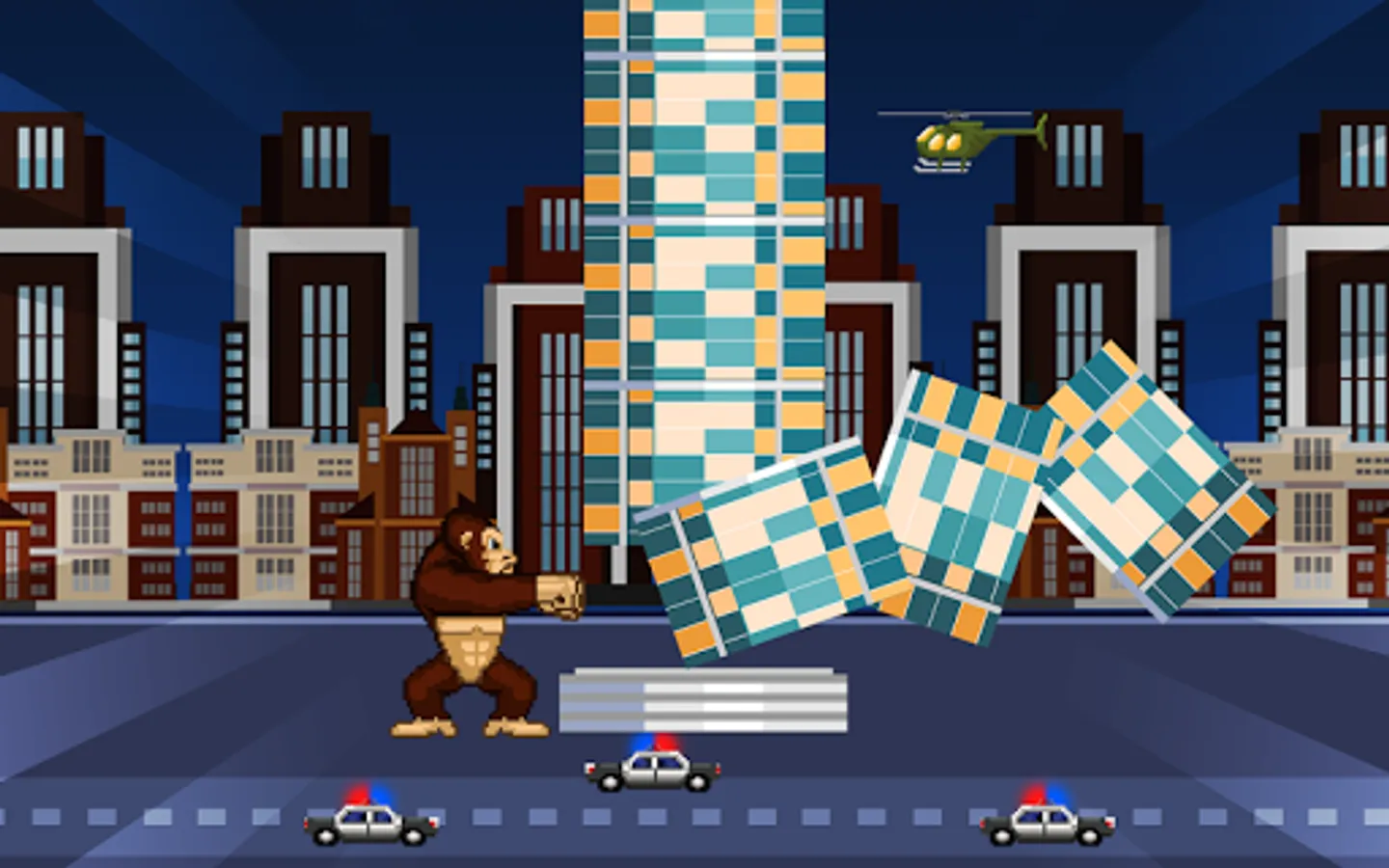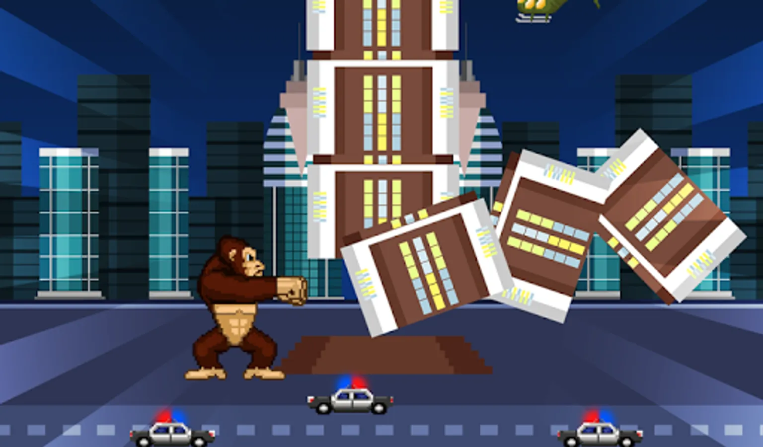 In the game King Kong breaks the blocks of a skyscraper of one of the largest cities in the world: New York, Los Angeles, Washington. During the game, you can get in the way: police cars, a tank, helicopters, soldiers of the US Marine Corps. The task of King Kong is to avoid the fall of helicopters, which can fall on the head of the gorilla. Looks like a simple task? Is it easy for you to play? Then go ahead! Improve your skills, enter the TOP-100 best players in the leaderboards.