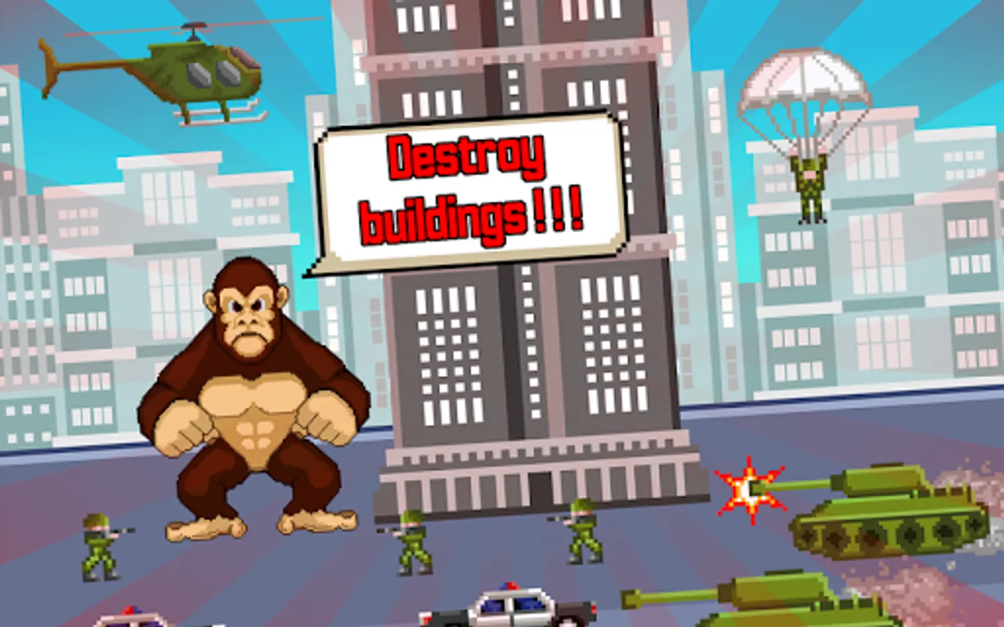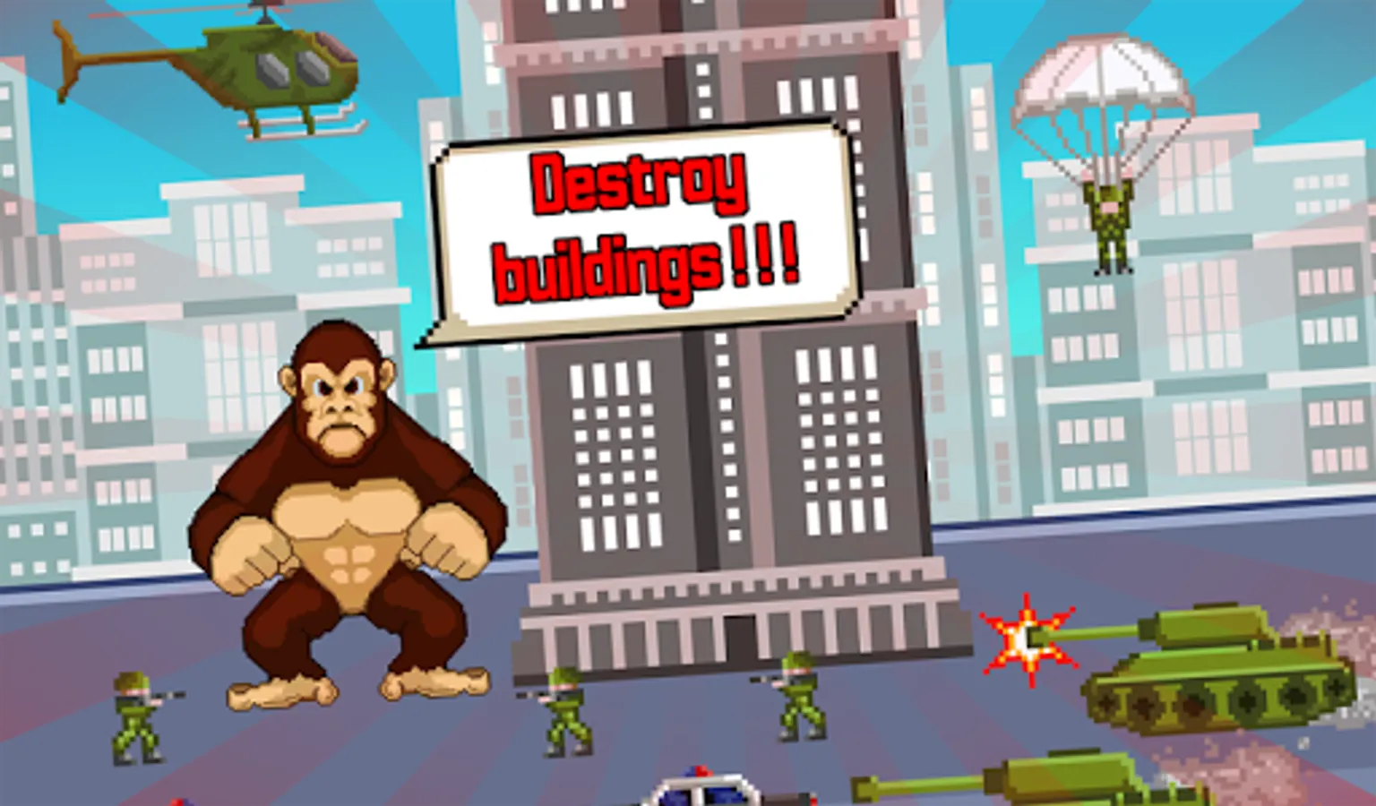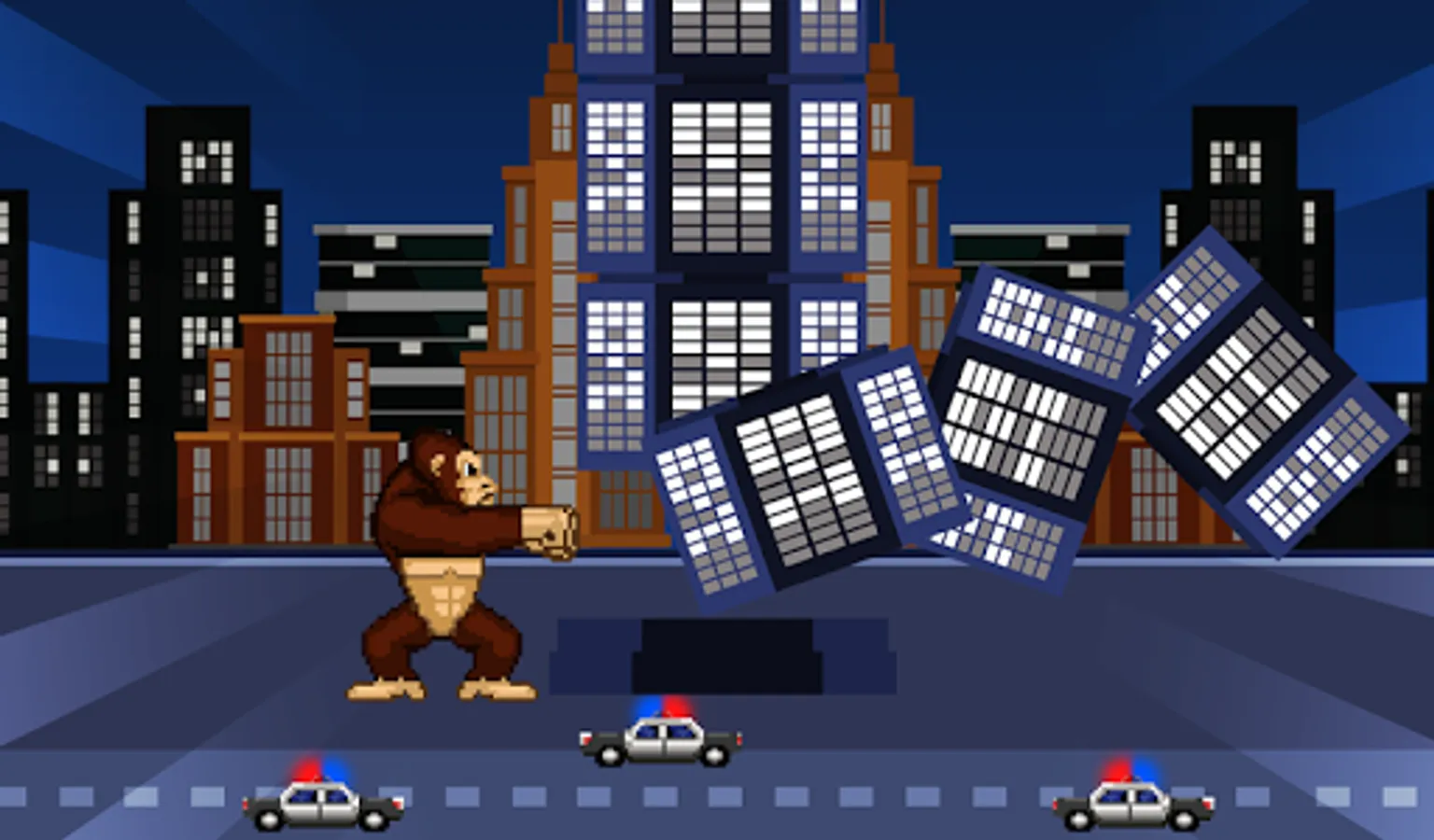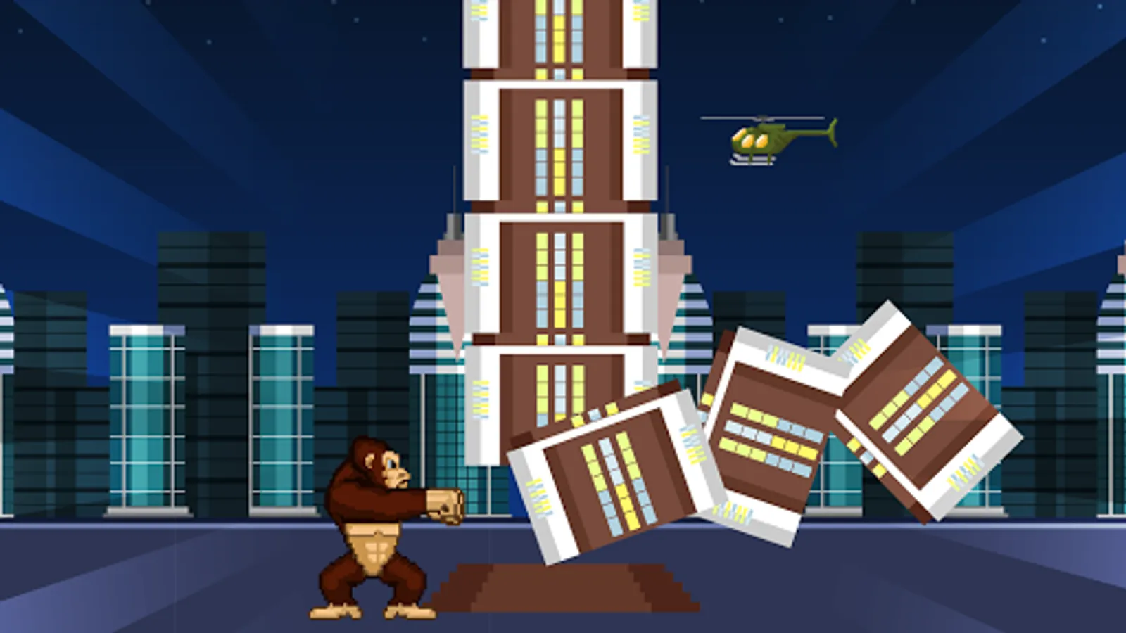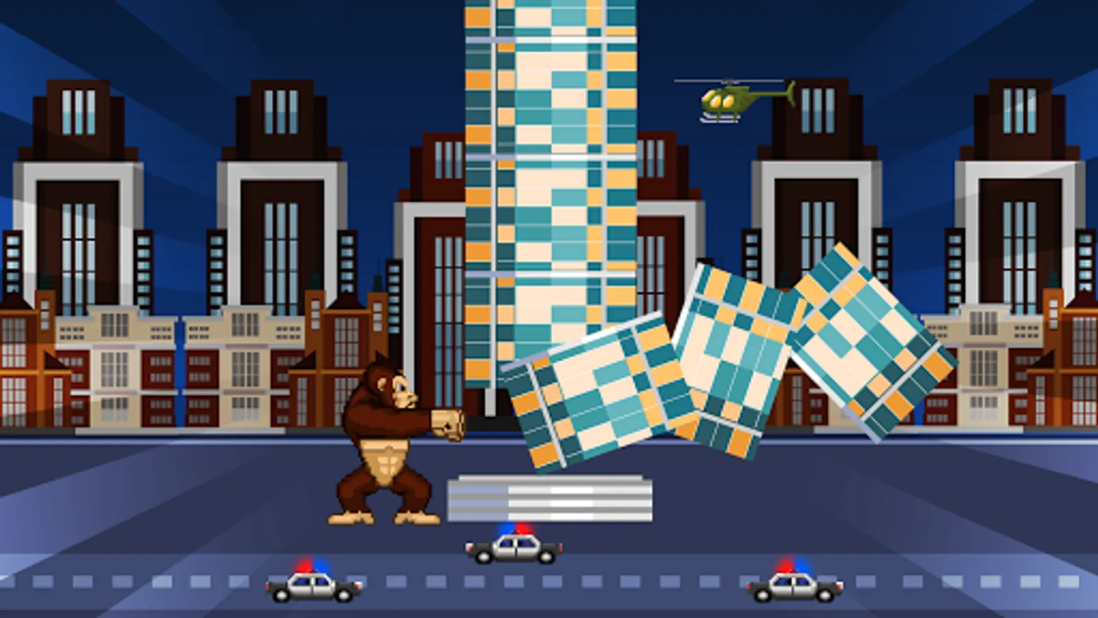 In the game King Kong breaks the blocks of a skyscraper of one of the largest cities in the world: New York, Los Angeles, Washington. During the game, you can get in the way: police cars, a tank, helicopters, soldiers of the US Marine Corps. The task of King Kong is to avoid the fall of helicopters, which can fall on the head of the gorilla. Looks like a simple task? Is it easy for you to play? Then go ahead! Improve your skills, enter the TOP-100 best players in the leaderboards.