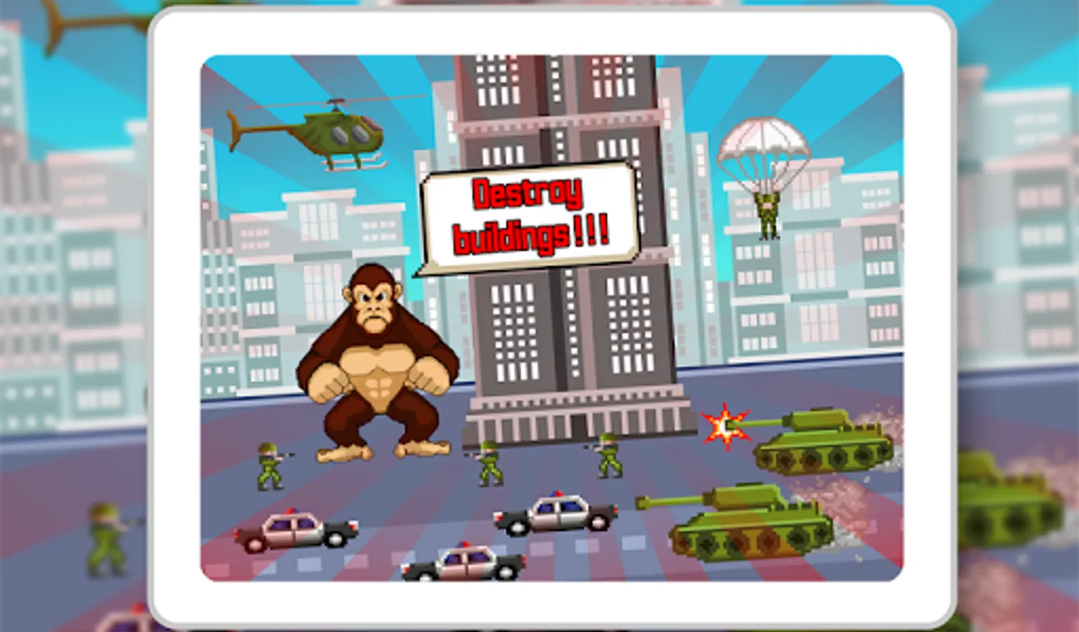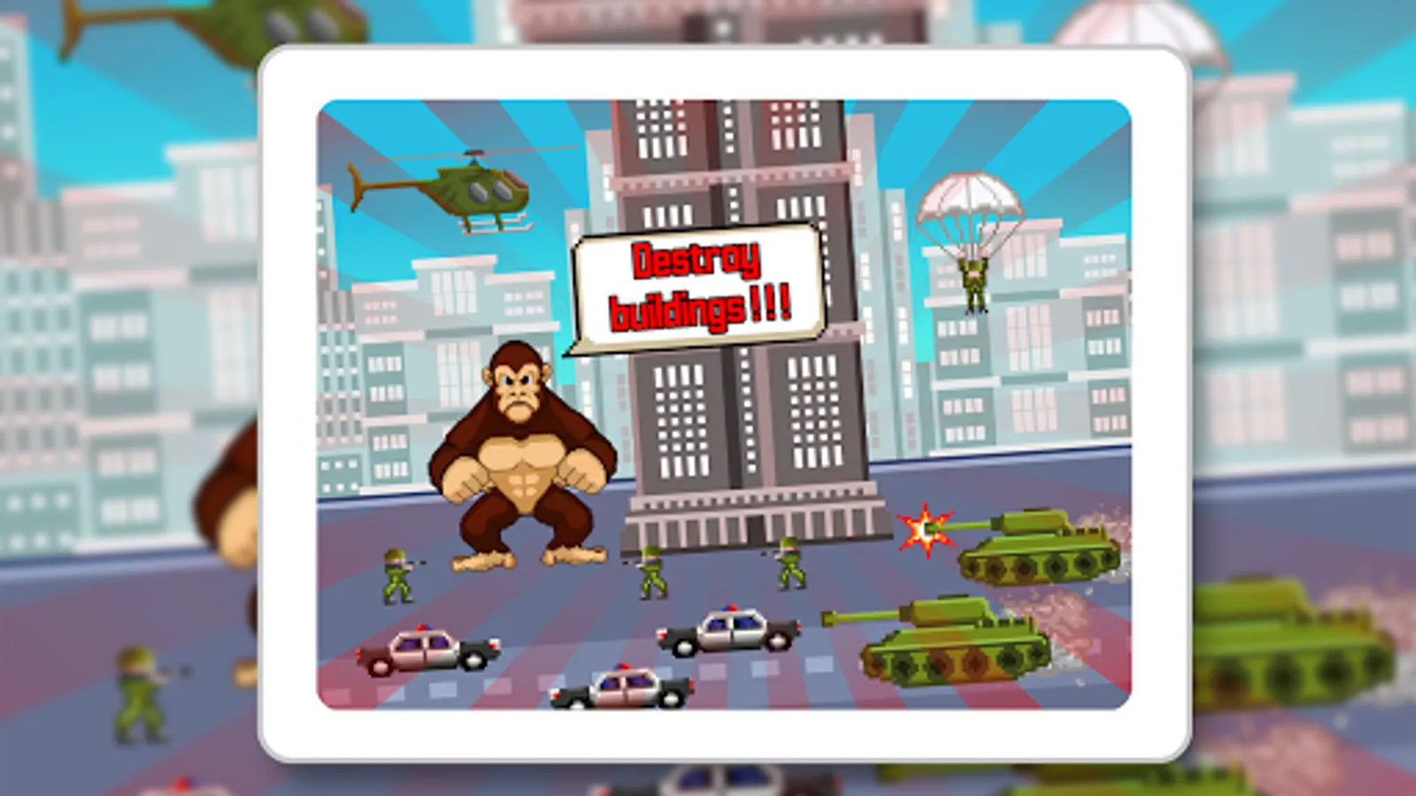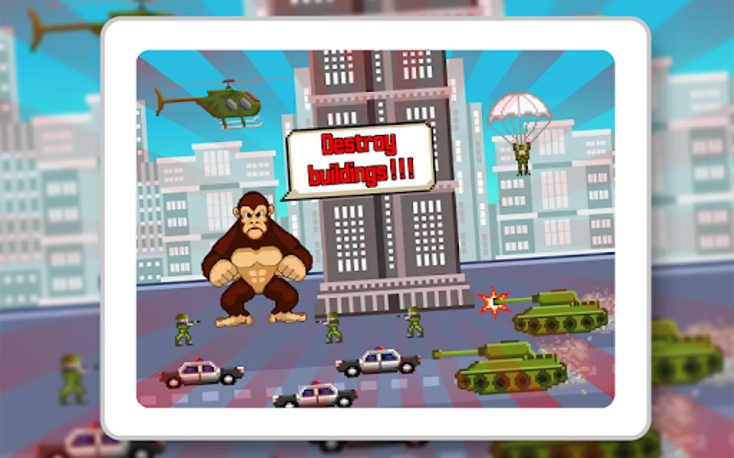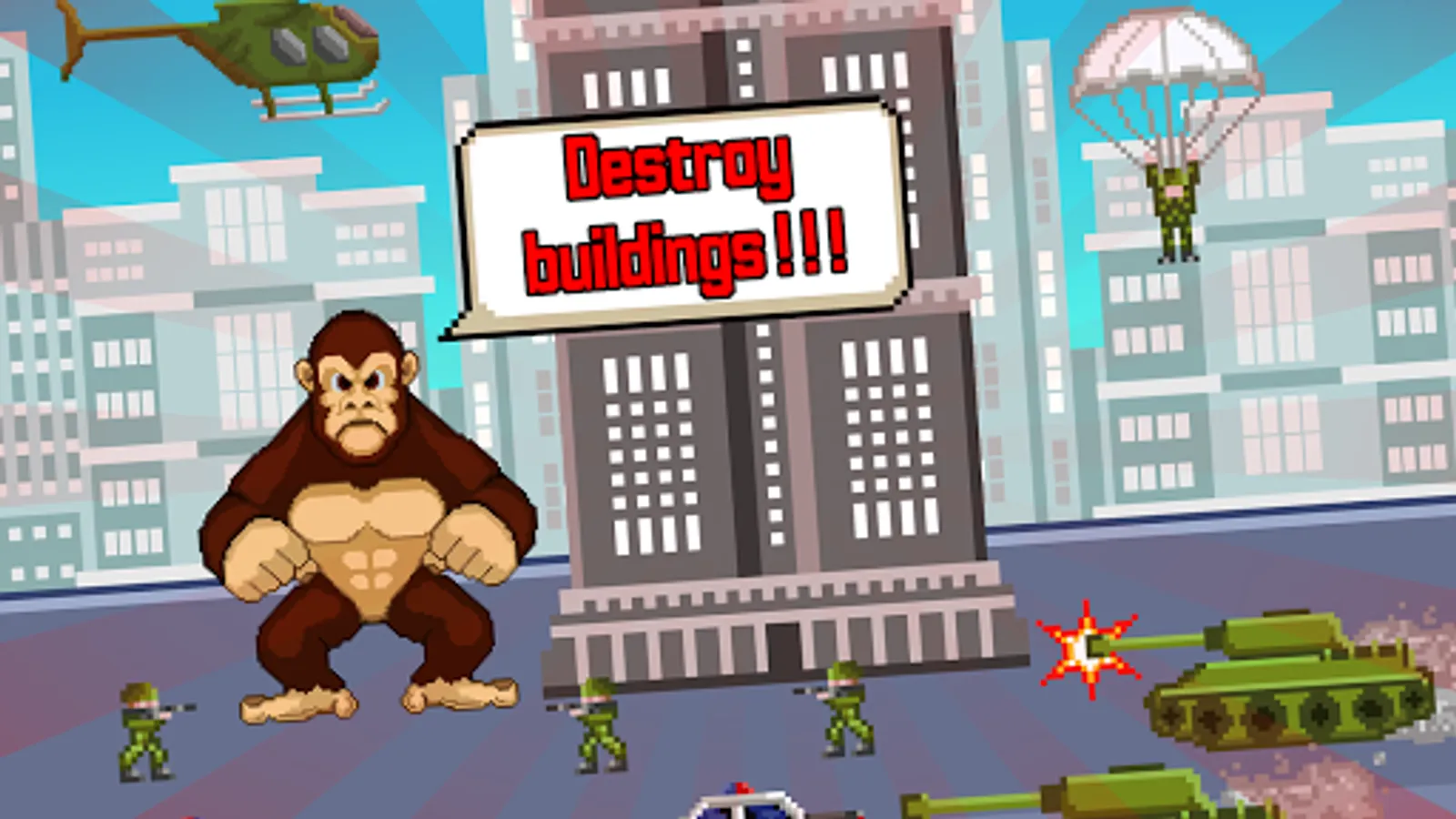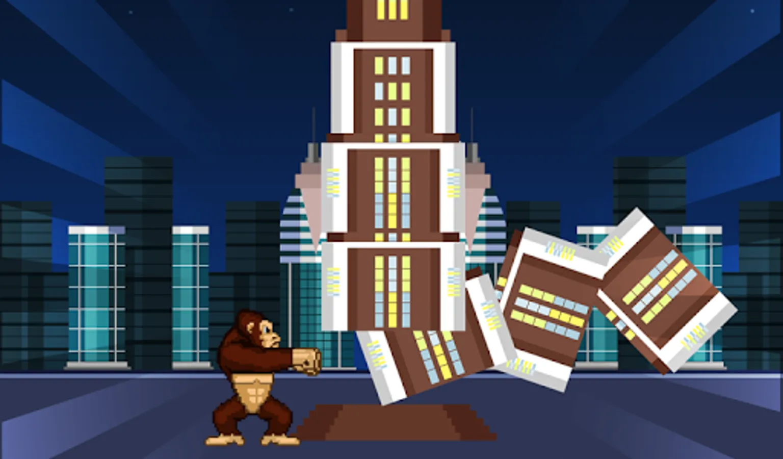 In the game King Kong breaks the blocks of a skyscraper of one of the largest cities in the world: New York, Los Angeles, Washington. During the game, you can get in the way: police cars, a tank, helicopters, soldiers of the US Marine Corps. The task of King Kong is to avoid the fall of helicopters, which can fall on the head of the gorilla. Looks like a simple task? Is it easy for you to play? Then go ahead! Improve your skills, enter the TOP-100 best players in the leaderboards.