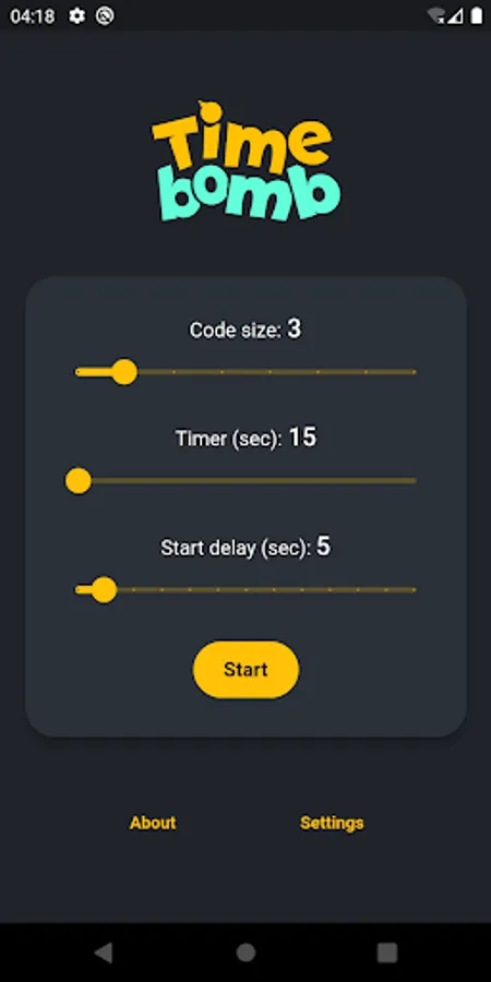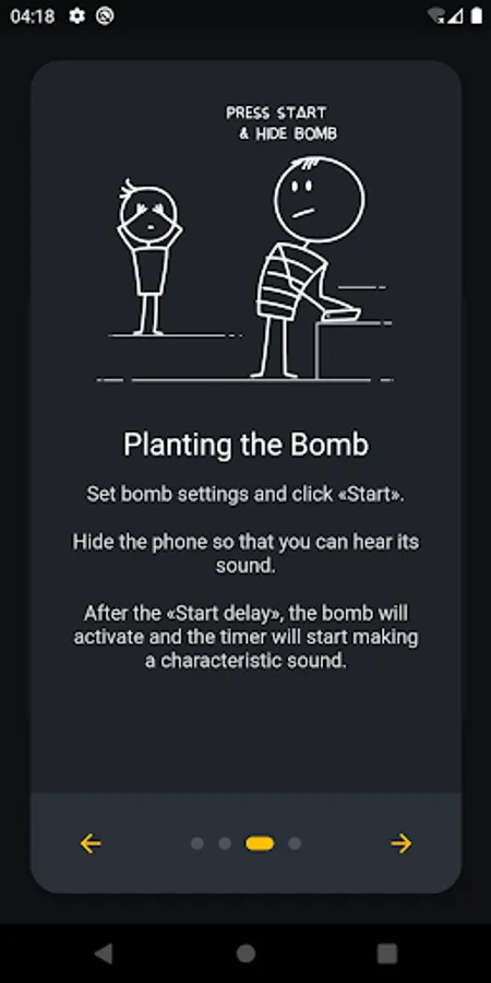 Set bomb settings and click «Start». Hide the phone so that you can hear its sound. After the «Start delay», the bomb will activate and the timer will start making a characteristic sound.