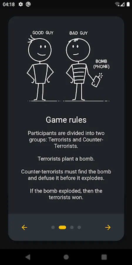 Participants are divided into two groups: Terrorists and Counter-Terrorists. Terrorists plant a bomb. Counter-terrorists must find the bomb and defuse it before it explodes. If the bomb exploded, then the terrorists won.