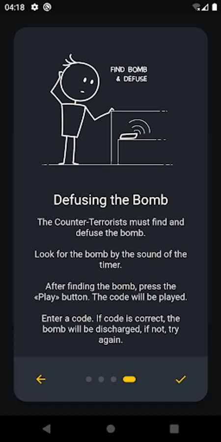 The Counter-Terrorists must find and defuse the bomb. Look for the bomb by the sound of the timer. After finding the bomb, press the «Play» button. The code will be played. Enter a code. If code is correct, the bomb will be discharged, if not, try again.
