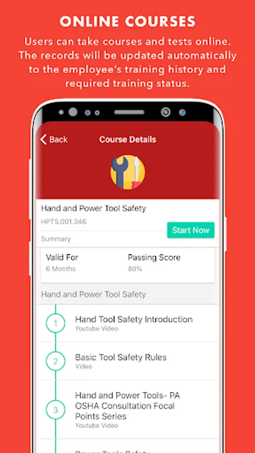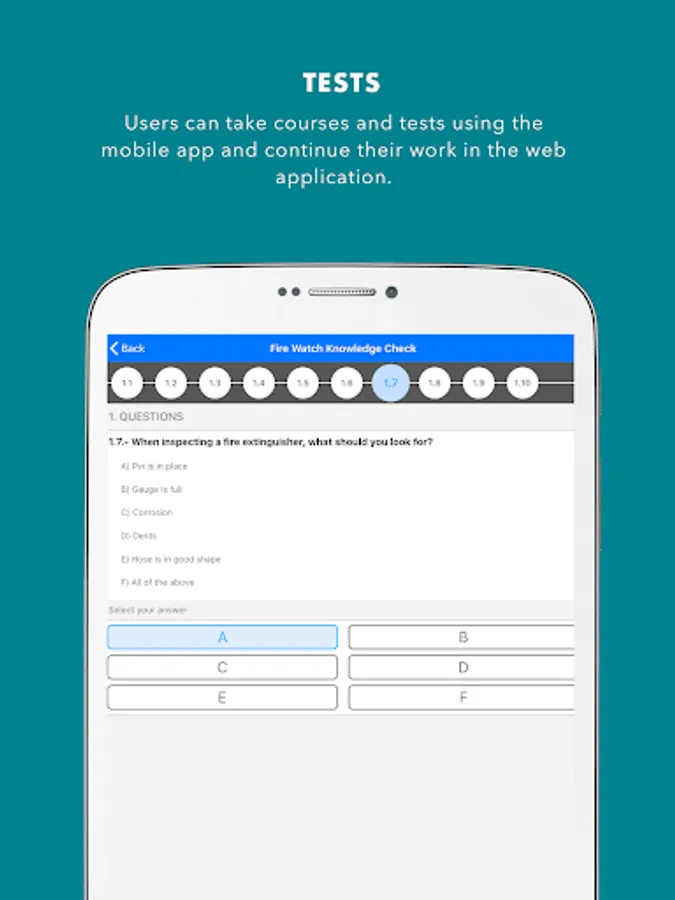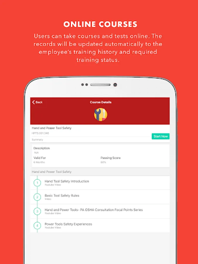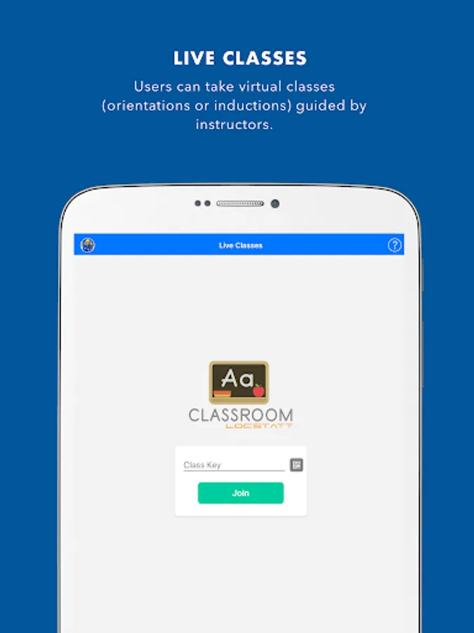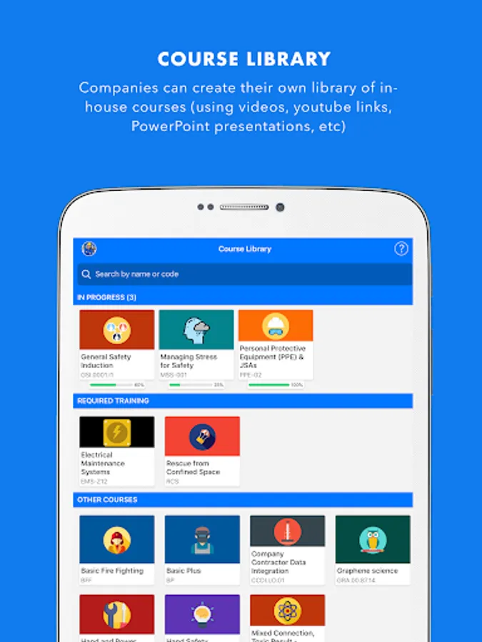 • The mobile classroom application for employees to take courses online, with or without tests and for them to be able to check their required training and history. They can also continue these courses later in the web application.