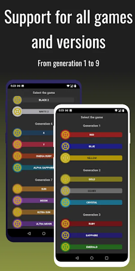 Support for Red, Blue, Yellow, Gold, Silver, Crystal, Ruby, Sapphire, Emerald, Fire red, Leaf green, Diamond, Pearl, Platinum, Heartgold, Soulsilver, Black, White, Black 2, White 2, X, Y, Omega Ruby, Alpha Sapphire, Sun, Moon, Ultra Sun, Ultra Moon, Let's Go, Sword, Shield, Isle of Armor, Crown Tundra, Brilliant Diamond, Shining Pearl, Legends, Scarlet and Violet, The Hidden Treasure of Area Zero, The Teal Mask, The Indigo Disk .