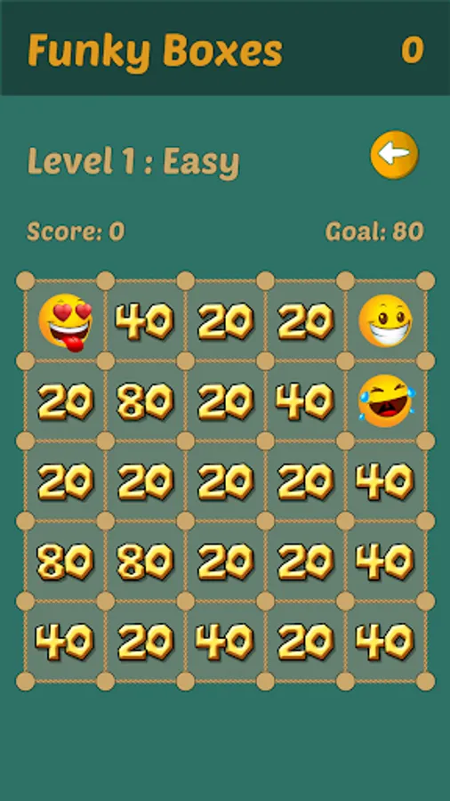 Click the line between the circles to connect a border. Once all 4 borders of a box are connected, the points will be either added or deducted from your score, depending on who connected the last border of the box. When you connect all borders of a single box, you get to play another move. Collect all three special boxes to reach the bonus level and win additional points! Once all the boxes are taken the level is completed and your score is compared to your goal. If you reach your goal mid-game be careful, the game is not over until all the funky boxes are taken by you or the computer!