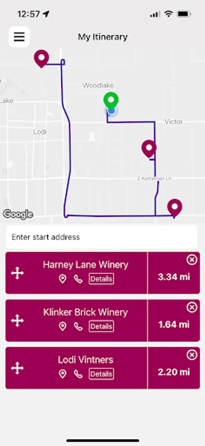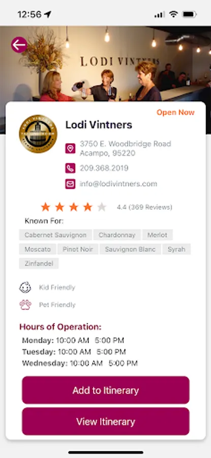 Lodi Tasting is an interactive winery map that allows users to create wine tasting itineraries and explore the Lodi Wine Region. Sort through local wineries by your favorite varietals, filter wineries by criteria such as kid friendly, pet friendly, food available, and more, then create a custom wine tasting itinerary tailored to your preferences. It's easy-- simply add the wineries you want to visit to your itinerary by hitting the large "Add To Itinerary" button at the bottom of each winery listing and our app will automatically create an optimized navigation route based on your current location or a user defined starting location.