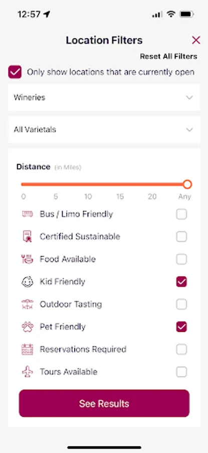 Lodi Tasting is an interactive winery map that lets you sort by varietals and filter wineries by criteria such as kid friendly, pet friendly, food available, etc.