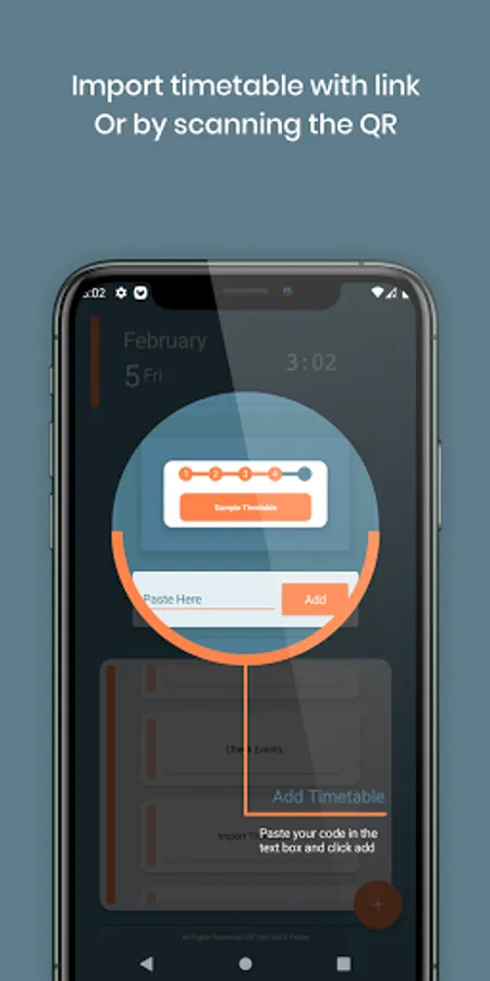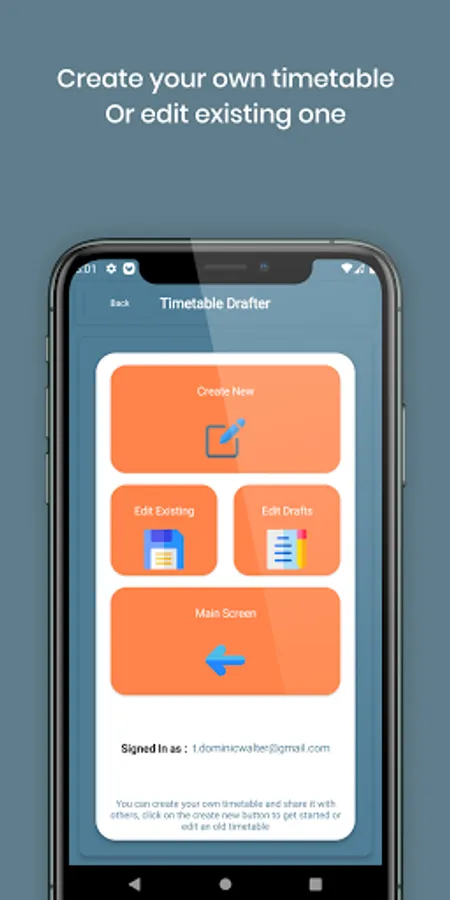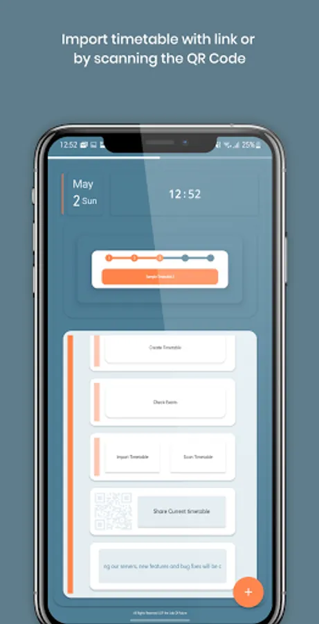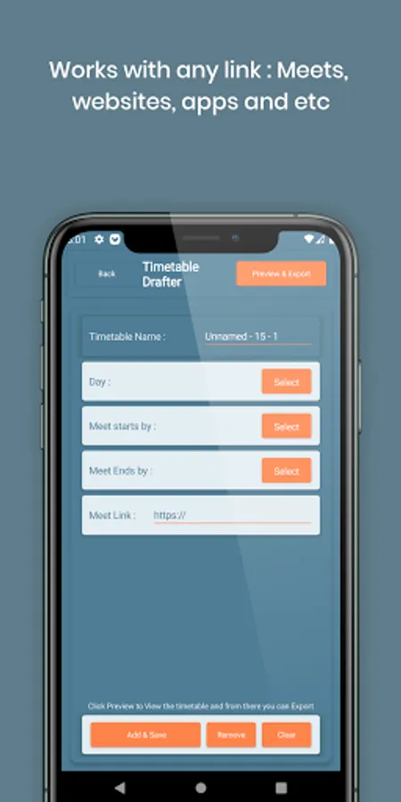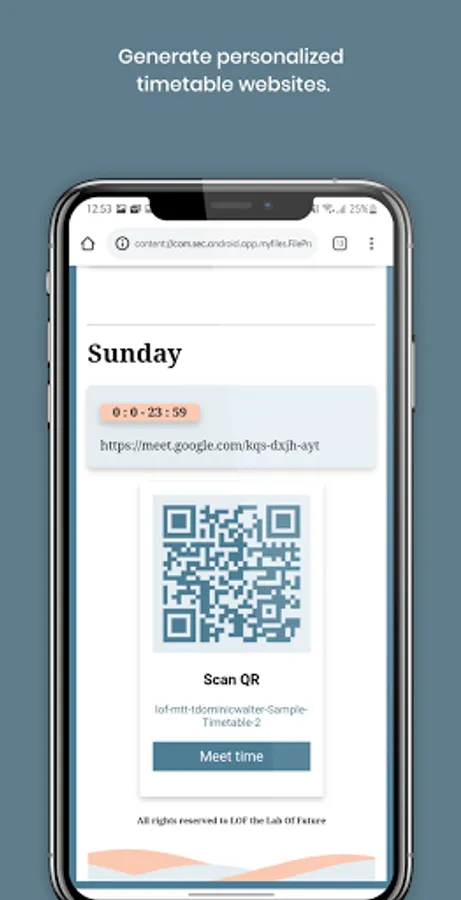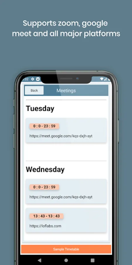 You can create your own timetables with your schedules, by clicking the “Create Timetable” button, Enter the starting time, the ending time, and link for the meeting, the app supports a wide range of apps and links, ZOOM, Google Meet, Microsoft Teams, and similar meeting platforms. The app is also compactable with regular links (Links of websites). Sign in with your Google account to Create and share your timetables, On successful export of a timetable, the app will generate a QR Code and a sharable link, this QR Code can be Shared or Printed. People with the link can enter it in the app and import, can scan the QR Code to add that timetable to their app.