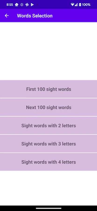 • sight words, that include 2 letters words, 3 letters words, 4 letters words, first most important 100 sight words, and the next 100 sight words.
