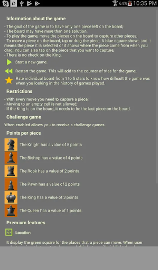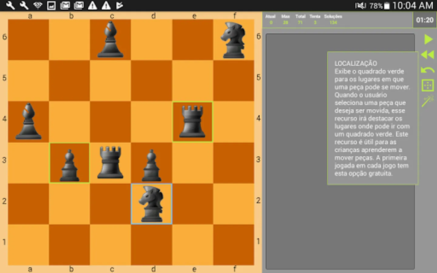 • Location to move a piece, it displays the green square for the places that a piece can be moved to. When the user selects a piece that wants to be moved, this feature will highlight the places where it can go with green square(s). This feature is helpful for children to learn how to move pieces. The first move on each game has this option free.