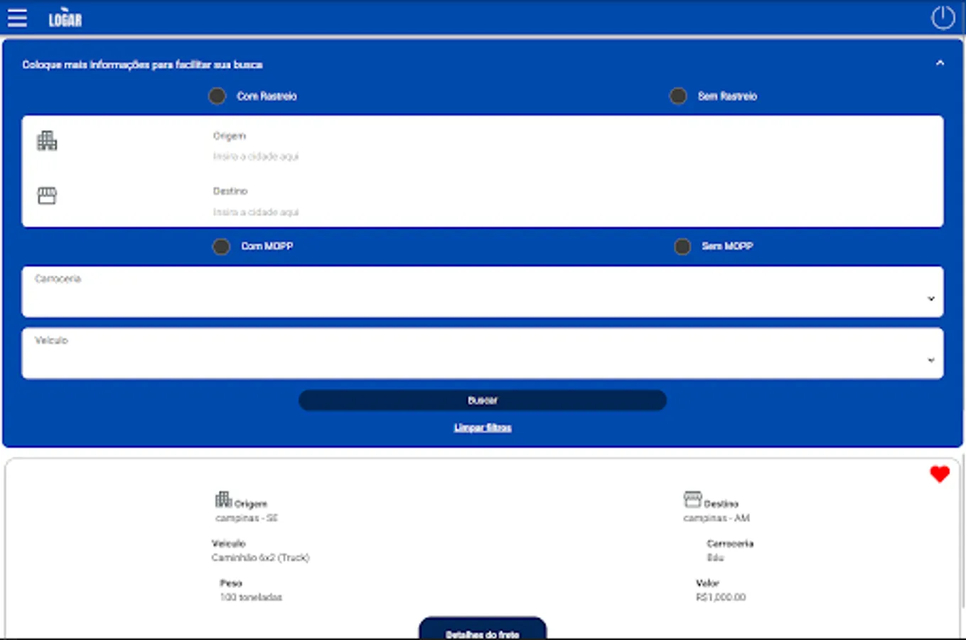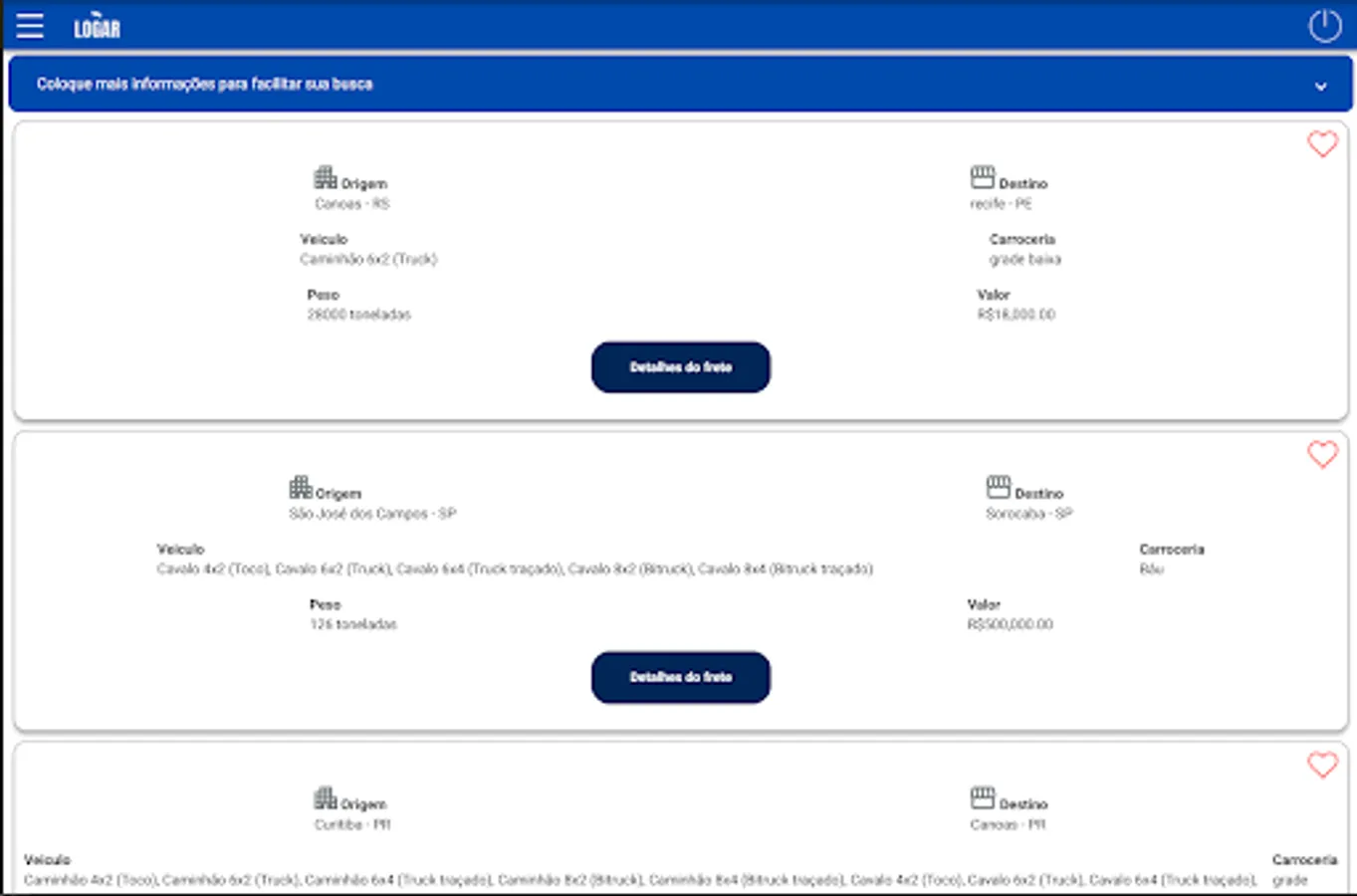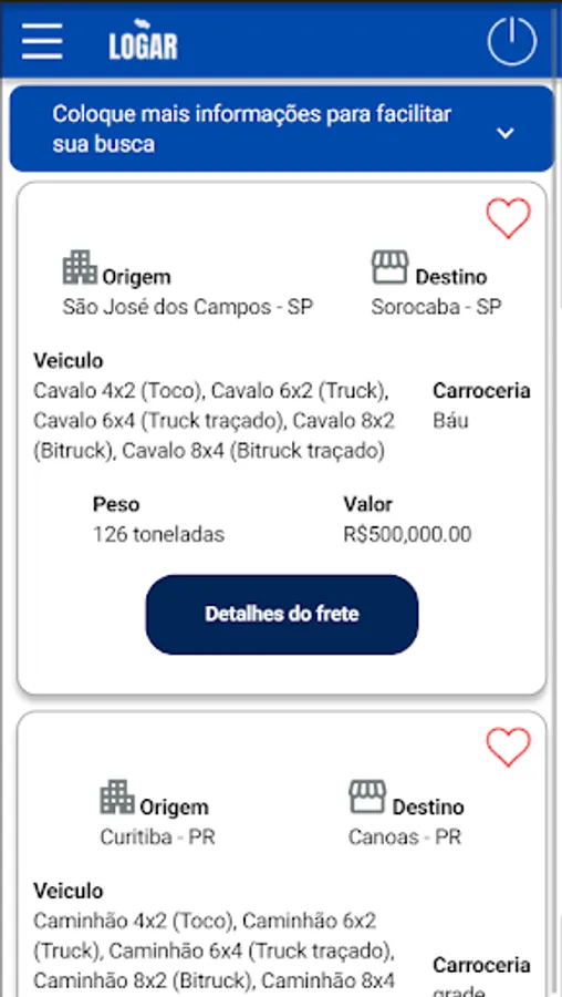 Download the application and search for the shipping you want, with a few clicks and choose the will in a practical and safe way. Now with the Logar Express app, in addition to searching for the ideal shipping, you won't have to return empty or waste time. There is and if you are in need of something for you and your brute, look for the trucker market, there you will find offers tailored to the truck driver and of quality your brute.