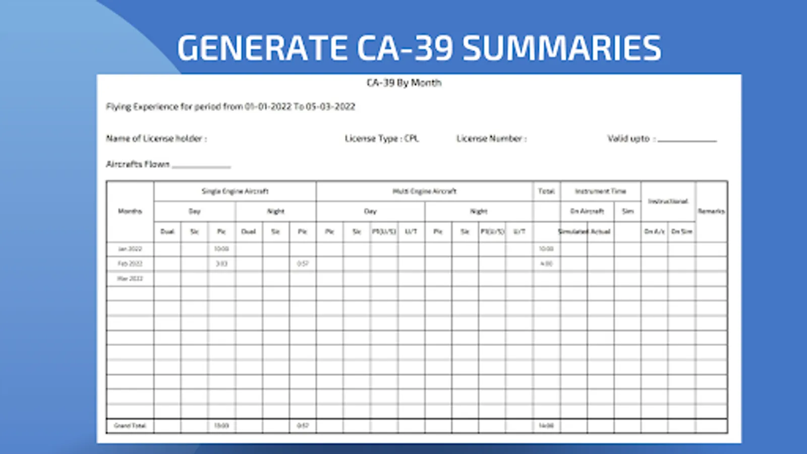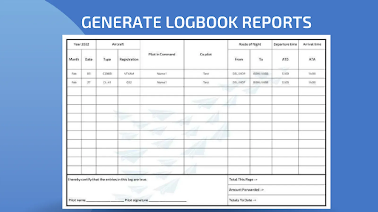 * Download Logbook Reports in various formats (currently supports All Major Indian DGCA formats, more to be added soon). No need for totalling your physical logbook on every page. Just copy down from auto-totalled PDF reports
