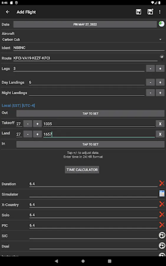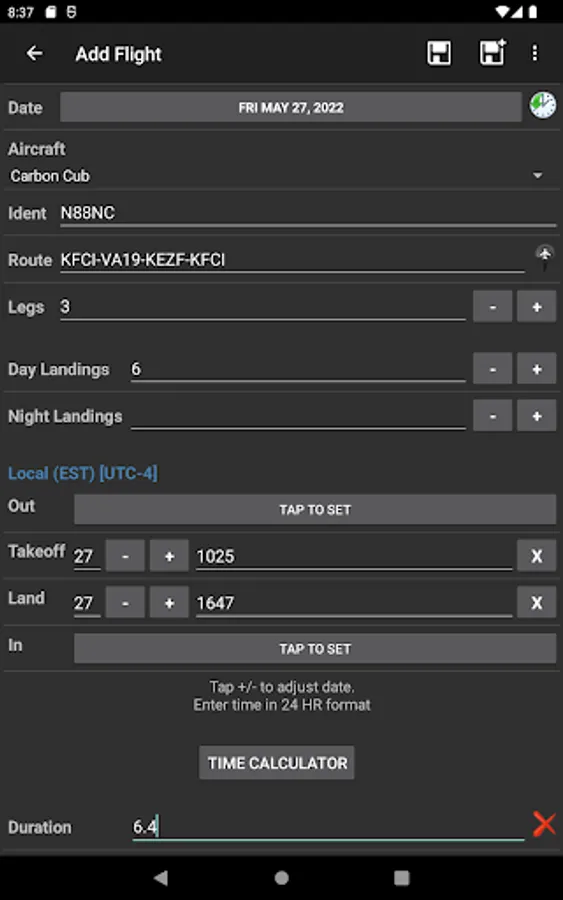 * Calculate duration from OUT-IN or TAKEOFF-LAND times with the tap of a button