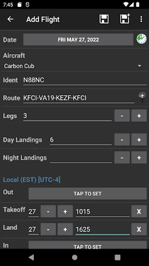 * Quick increment buttons to easily add/subtract values for fields such as landings, approaches, etc.