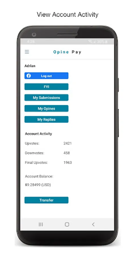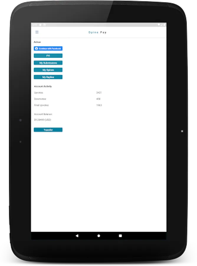 To receive your eGift card, you go to the "Account" section of Opine Pay and tap the "Transfer" button located at the bottom.