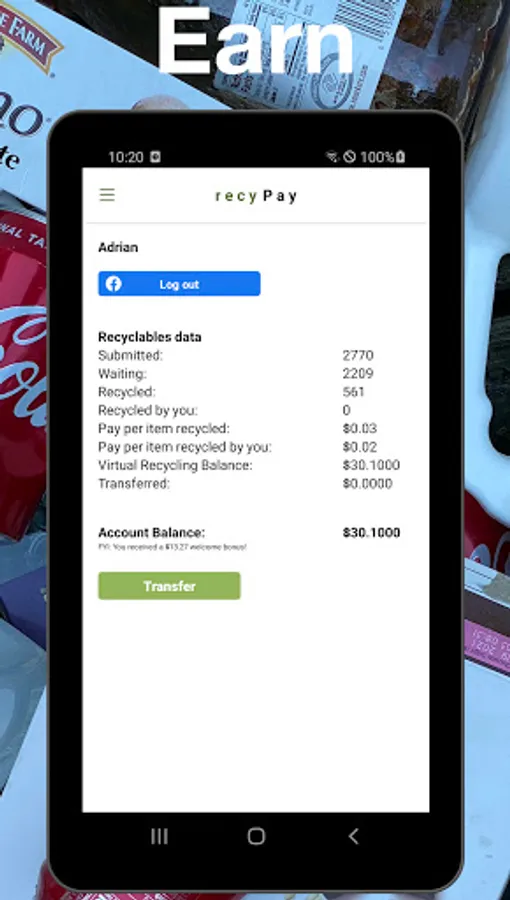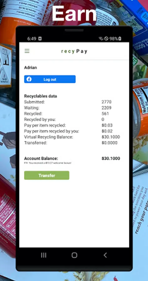 Go to the "Account" section of recyPay and tap the "Transfer" button located at the bottom.