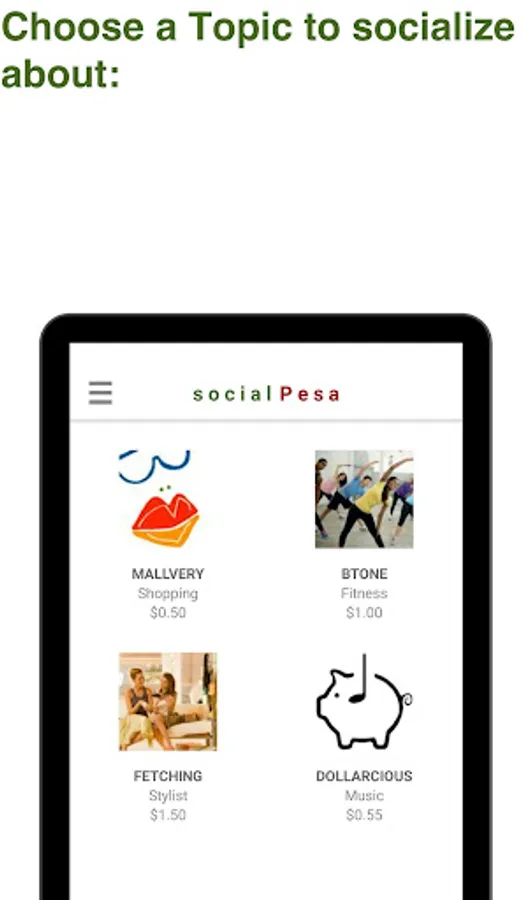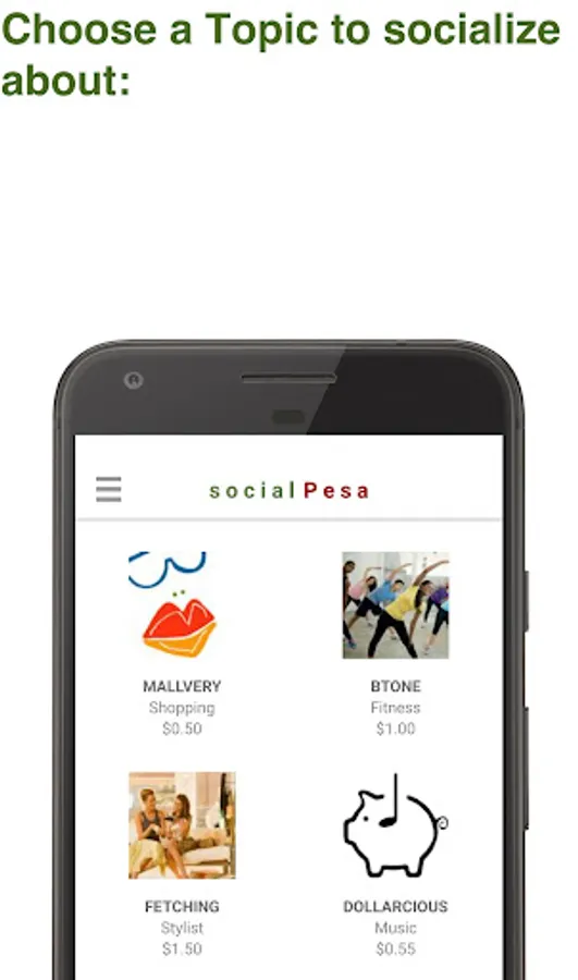 To determine that you're effectively social, the app assigns you Topics to socialize about with others. After receiving proof that you've effectively socialized about a Topic, the app deposits a payment into your socialPesa account.