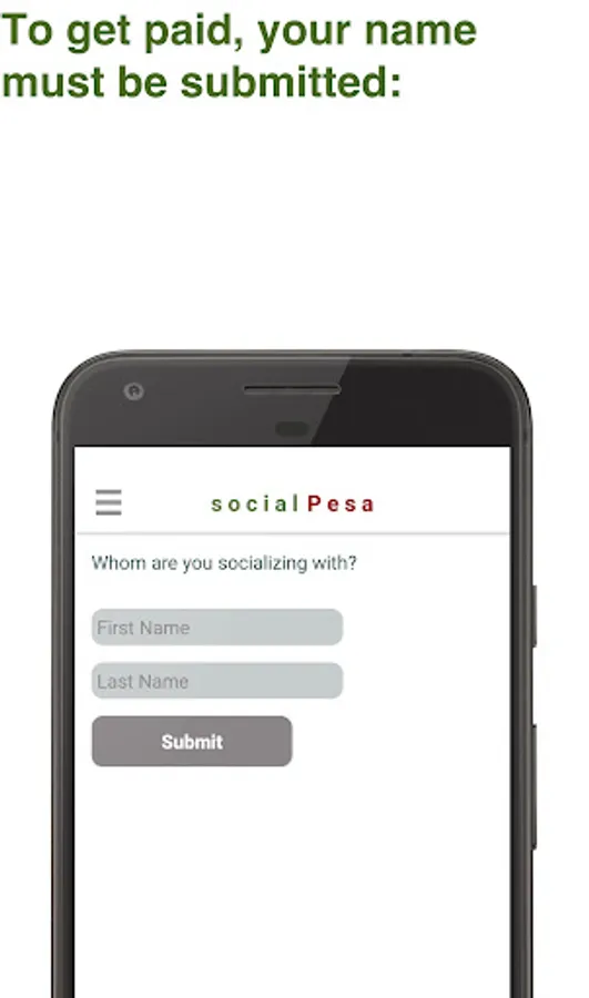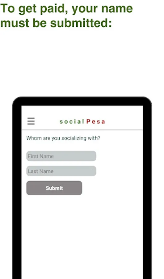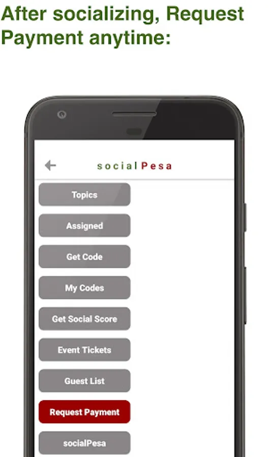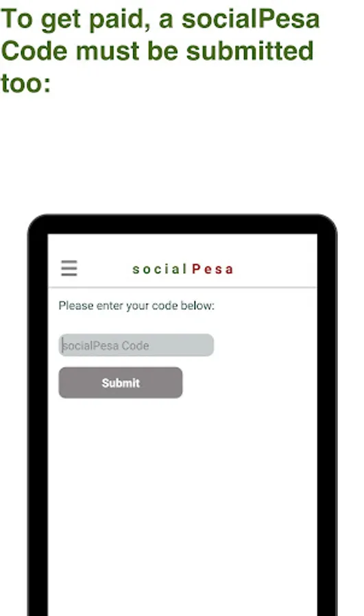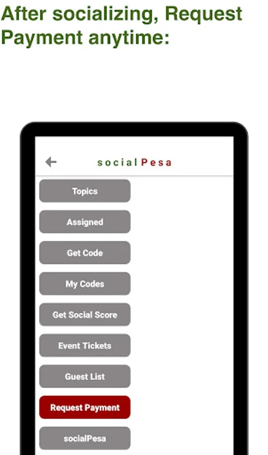 In socialPesa app's menu, he/she should tap "Get Code," then submit your name, then tap the icon of the Topic you've socialized about.