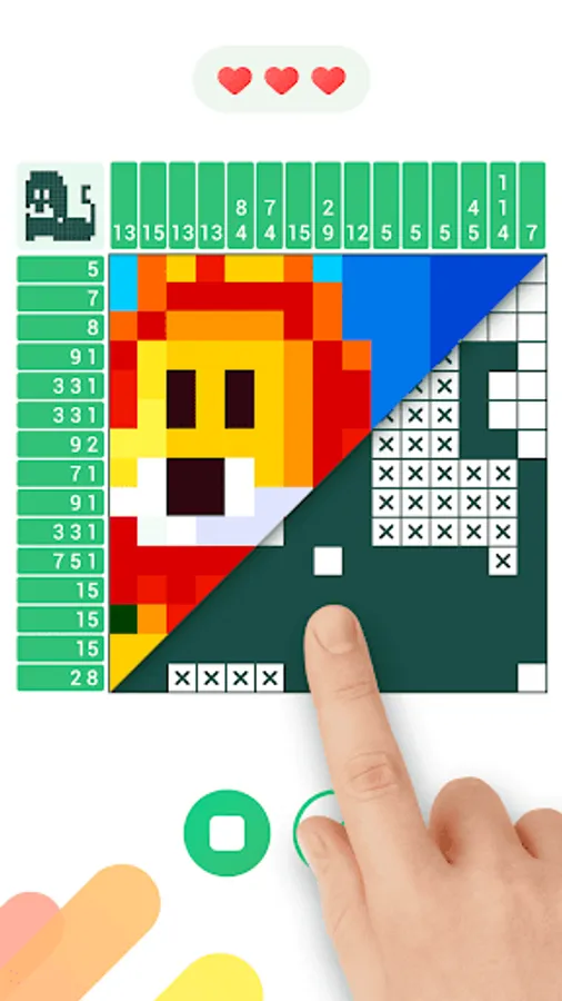 You need to use the logic to color the blocks in a grid and reveal hidden pictures.