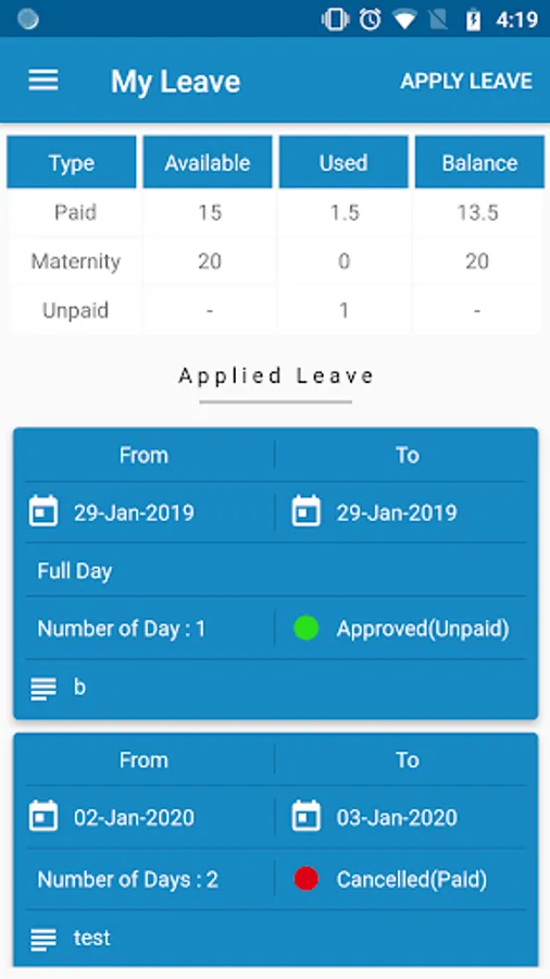 - The user can get available Leave details via App.