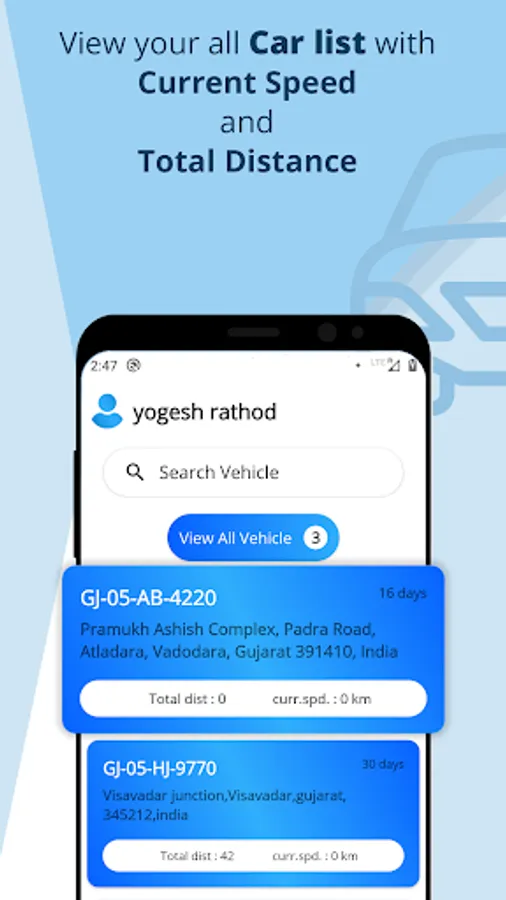 - You can view the all your vehicle list with total distance and current speed, and select vehicle to track live location, by selecting vehicle you are redirect to map view for view live location of selected vehicle.