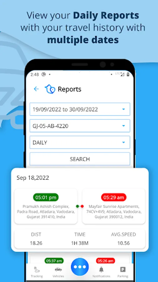 - You can get your reports of your daily trip path its include the start and end location address, start time and end time, total km, total distance, speed etc.