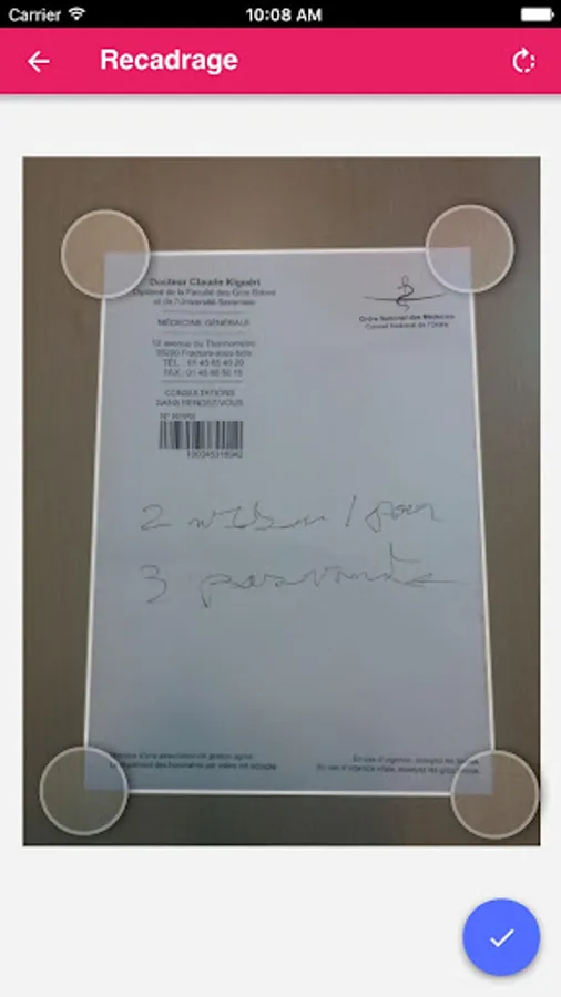 - Photograph prescriptions (no longer need to scan for SCOR), health insurance or any other document (photo of wound, mail, etc.) which will be automatically integrated into medical records;