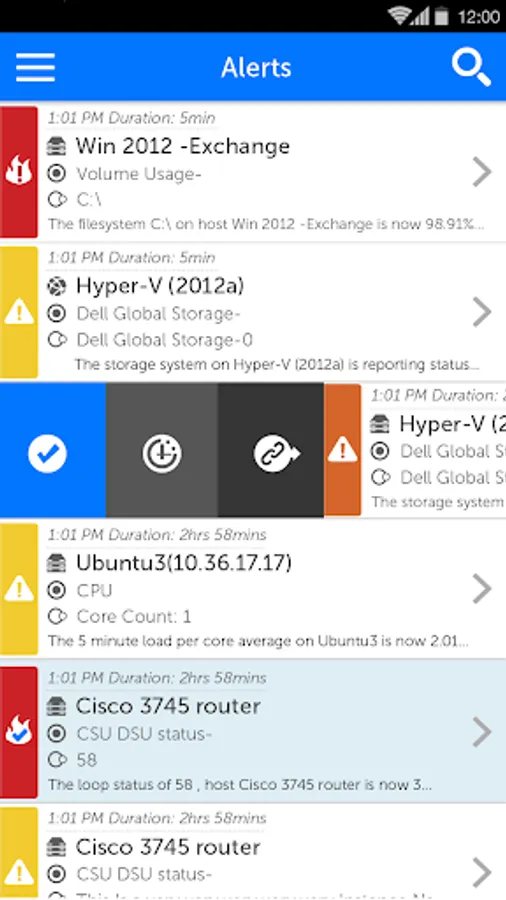Have all your active alerts and associated graphs at your fingertips along with the ability to swipe to acknowledge and escalate alerts or schedule down time for a device.