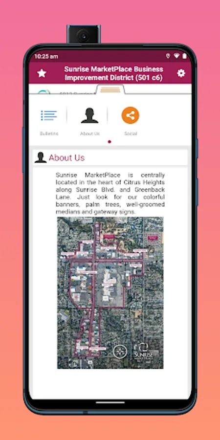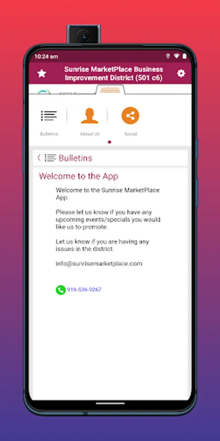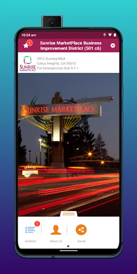 Welcome to the Sunrise MarketPlace Business Improvement District (501 c6) App. This App provides the perfect way for you to receive urgent notifications, get critical updates, bulletins and a calendar of events on your mobile device. The App features allow you the opportunity to easily submit feedback, send comments, photos and place calls to our organization with the touch of a button. Stay connected to the information that helps to maintain the high level of service that you demand!