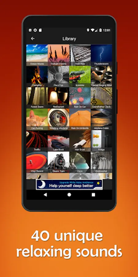 Ocean Waves, Insects, Train Ride, Thunderstorm, Campfire, Floor Fan, Sprinkler, Tibetan Singing Bowl, Forest Dawn, Restaurant, Rain On Car, Grandfather Clock, Cat Purring, Washing Machine, Rain On Umbrella, Airplane Cabin, Traffic, Lake Dock, Hair Dryer, Fridge, Vinyl Record, Steam Train, Cave, Dishwasher, Bathtub Running, Sandstorm, Clothes Dryer, Downspout, Cable Car Ride, Kettle, Waterfall, Ocean Storm, Hailstorm, Alarm Clock, Typewriter, Country Meadow, Blue Noise, Purple Noise, Pink Noise and White Noise.