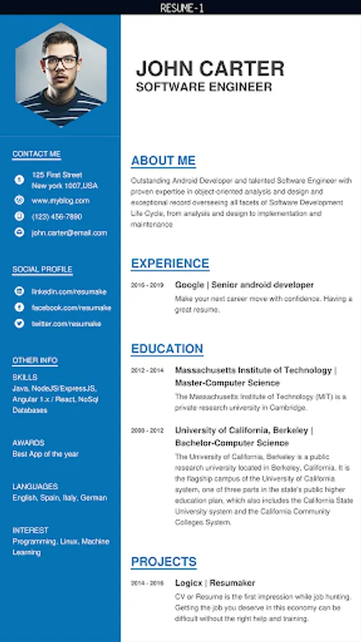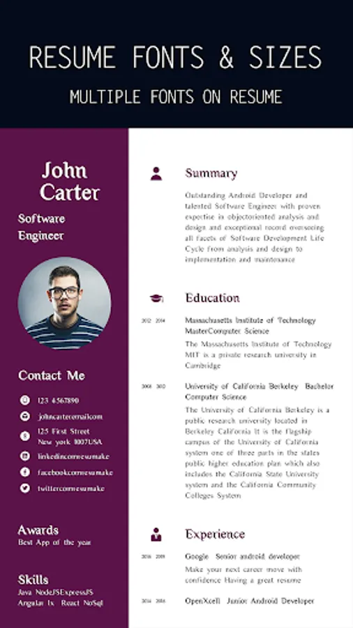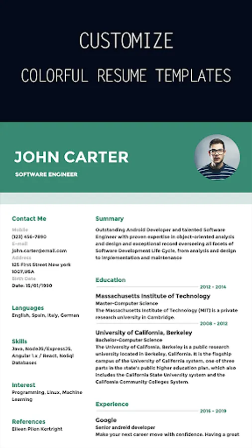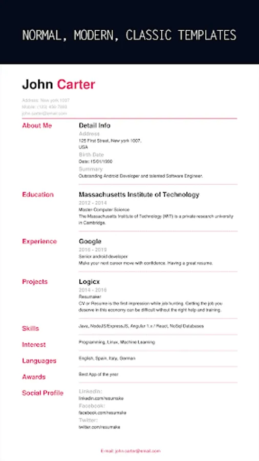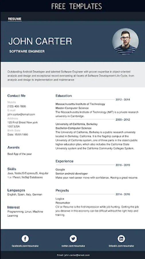 This my resume free app build resume / best resume creator can be used to create/make a resume CV design, Curriculum vitae, Professional resumes, perfect resumes.