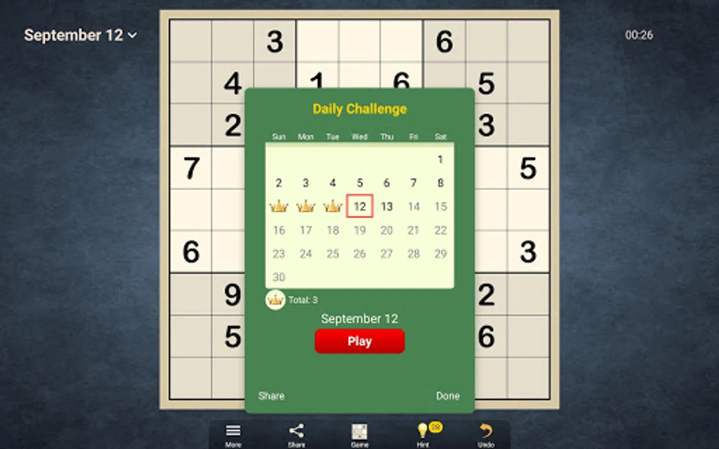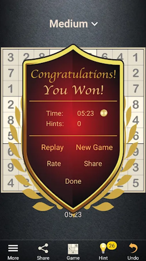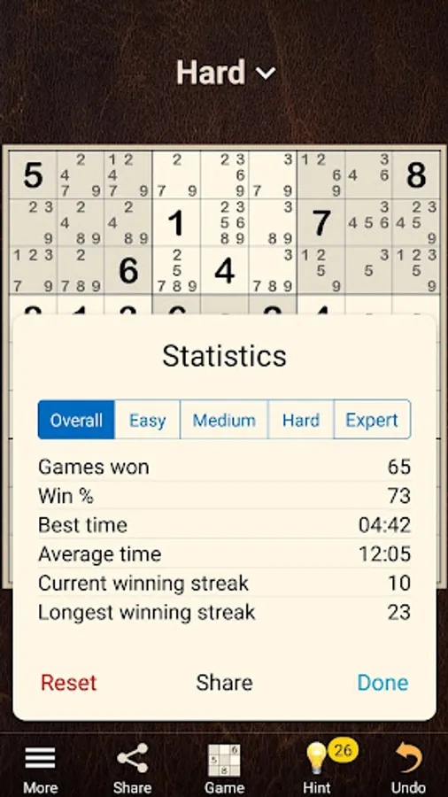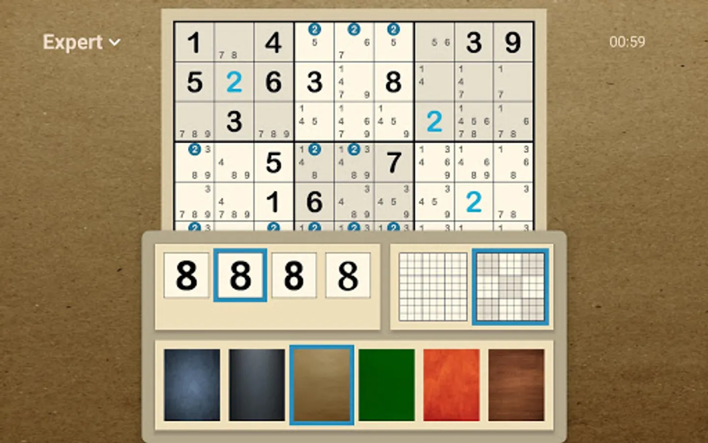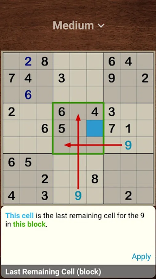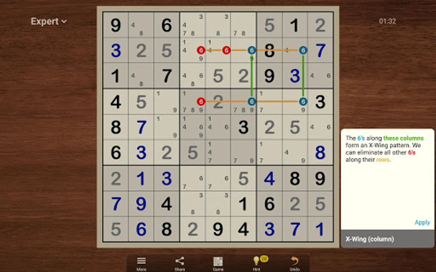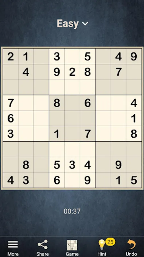 The game offers unlimited Sudokus in four difficulty levels from easy to expert. Each puzzle can be solved with logical reasoning; no guessing required. If you are new to Sudoku or want to try the next level up, use hints to learn new strategies. The advanced hint system will explain the logic behind each pattern and how to find it on your own. You will see that most of these strategies are not that difficult, even though it may be hard to find them on the board.
