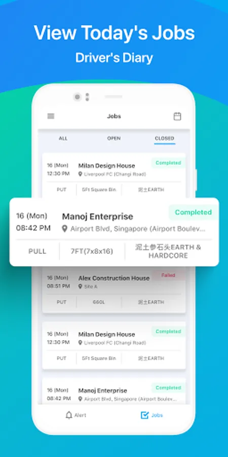 Jobs are dispatched to drivers' mobile app. Each job type has its own unique steps and add-on options by drivers. For example, jobs steps that appear on driver's mobile app for "Exchange bin" job type is different from "Put bin".