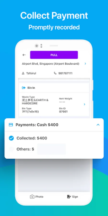 Step approach to ensure drivers complete jobs onsite with full details from the mobile app. Optionsl to enforce drivers to input bin number, photo taking, signature or collect payment.