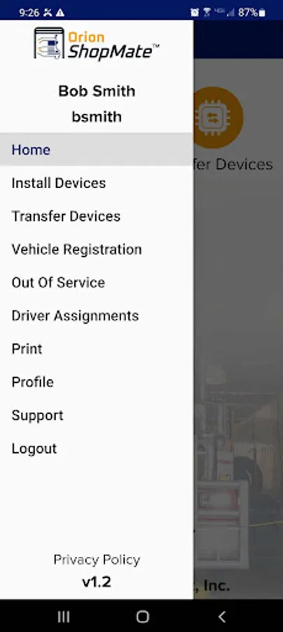 Orion ShopMate™ allows maintenance staff to electronically update vehicle readiness with a competitive mobile device. The shop data is seamless uploaded into the Orion proprietary cloud enterprise system which integrates vehicle data with the Orion Family of applications, to include, but not limited to Orion eLog ELD (Electronic Logging Device), Orion FreightMate™, Orion DockMate™, Orion VIS Enterprise, and other integrated applications.