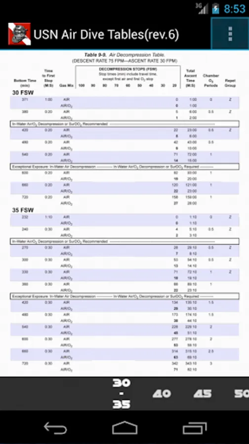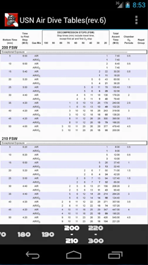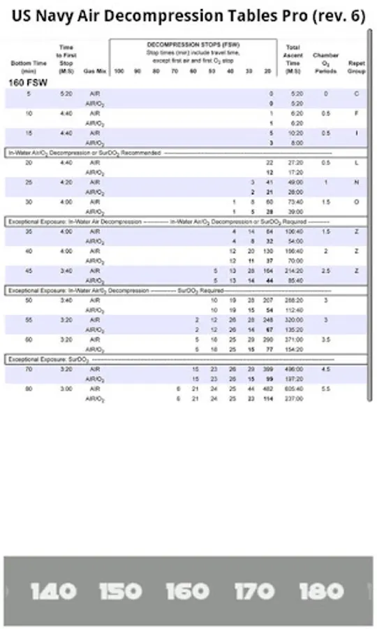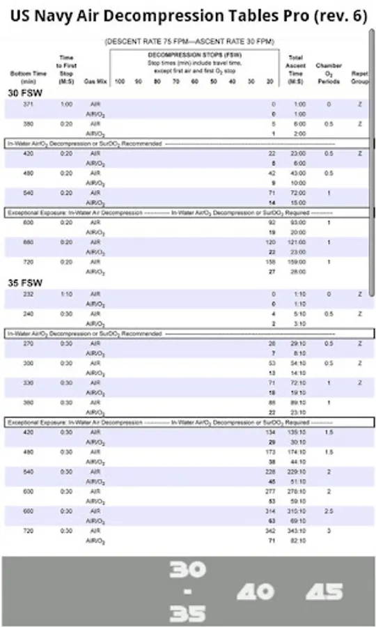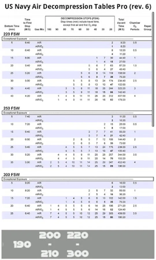 US Navy SCUBA Air Dive Tables contain tables from 30 feet to 300 feet as provided in Revision 6 of the US Navy Diving Manual.
