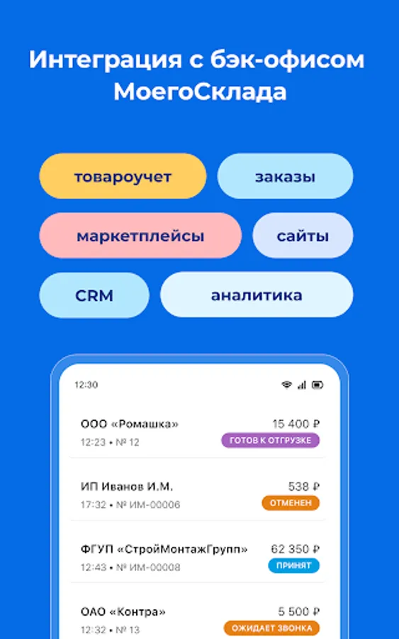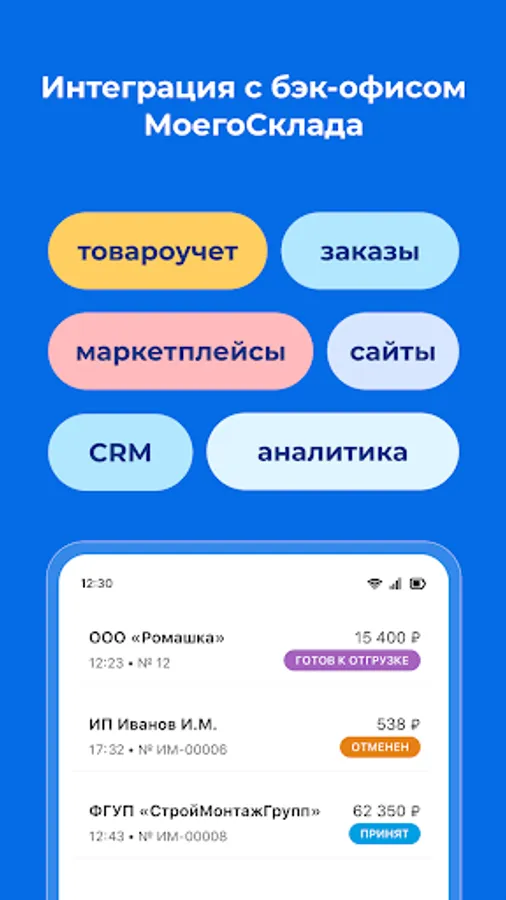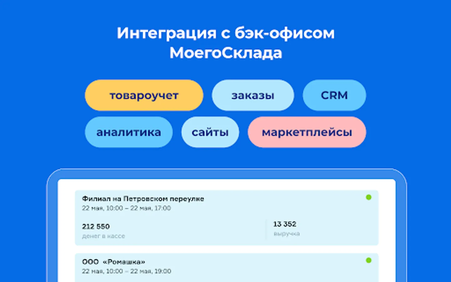 You can connect the MySklad cloud service to the application as an inventory system. In it, you can keep inventory records, plan purchases, set up a bonus program for customers, process orders from your online store, and control financial calculations. If you have a network of retail outlets, you can combine them: centrally manage goods and prices, monitor revenue dynamics in real time.