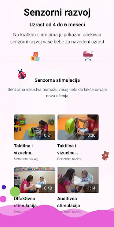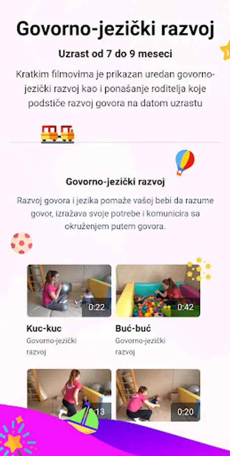 ➤ Video materials are created by experts with many years of experience, showing what is a regular development in the field of cognition, socio-emotional, speech-language and sensory development, gross and fine motor skills. For each area, 15 to 40 short shots are taken, which show the expected behavior of the child for a given age within the specified area.