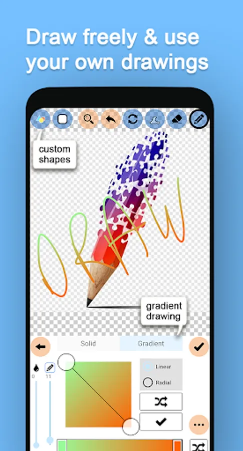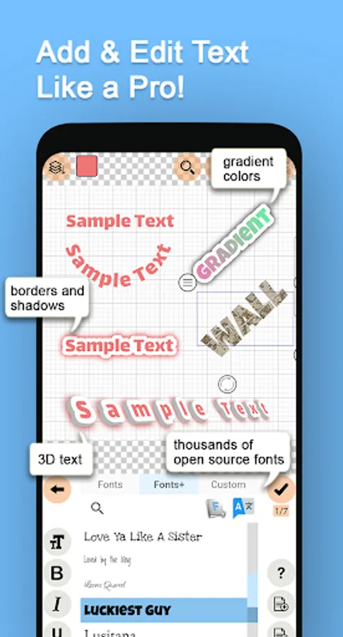 • Insert text with solid or gradient color, apply custom patterns, add border, shadow and 3D depth to it. Pick the most suitalble font inside 700 font types.