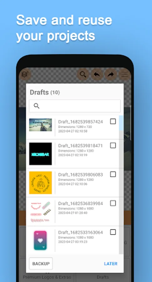 After you finish your design, you can save it as a draft so you can always come back later, modify it & generate a new design more awesome.