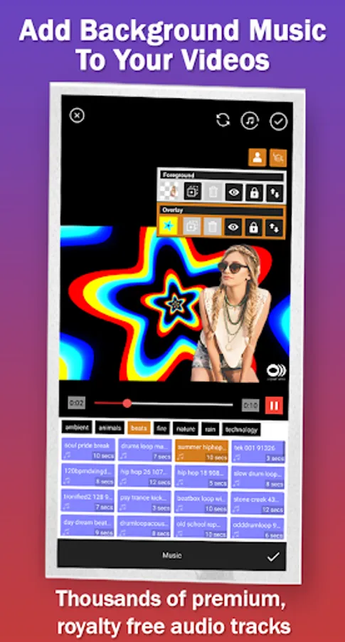 Add background music to your videos from thousands of royalty free audio tracks