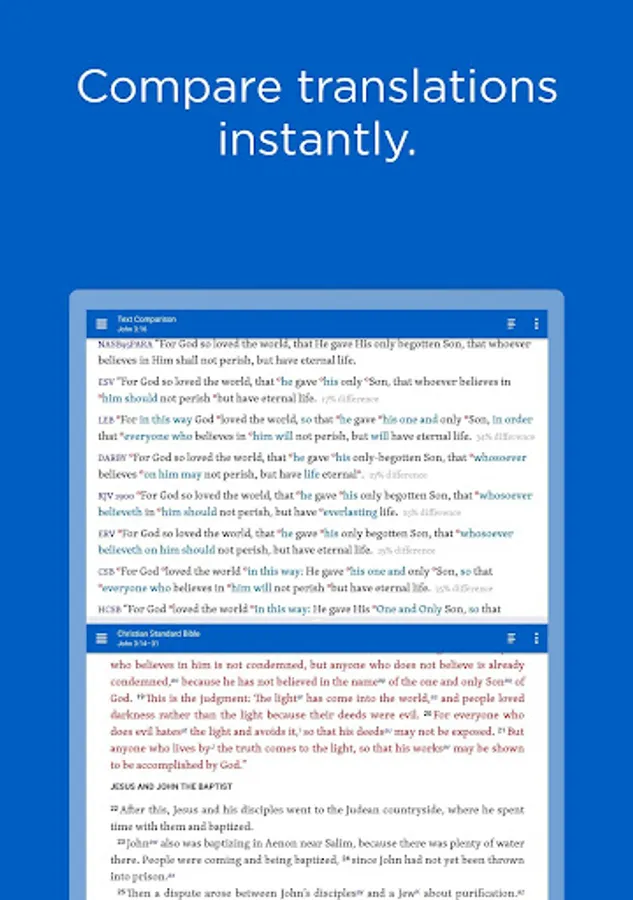 TEXT COMPARISON: Compare any verse in multiple translations with visual and percentage difference indicators.