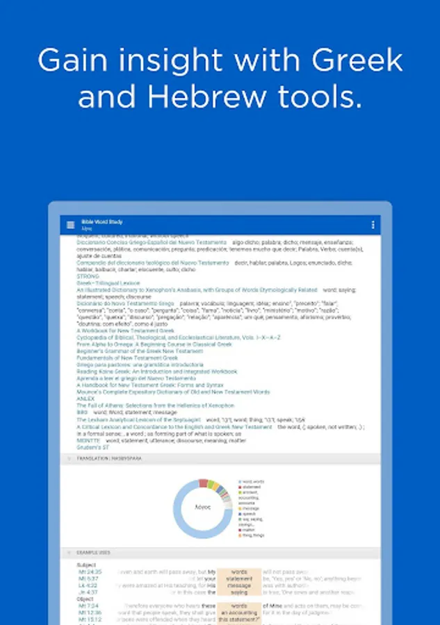 Access powerful Bible study tools and a theological library for biblical information anytime. With the Logos Bible app, you can read the Bible and commentaries side by side, download books for offline study, and use Logos' sophisticated study tools.