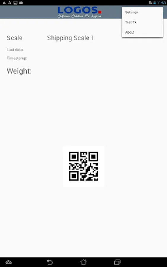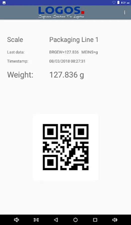The LOGOS Scale Barcode Display application connects your android tablet, via a separately purchased RS232 - USB-C adapter, to the RS232 port of your scale. Weight data from your scale is received and displayed as a 2D barcode, along with the readable weight enabling you to scan the 2D barcode into any application connected to your 2D barcode scanner.