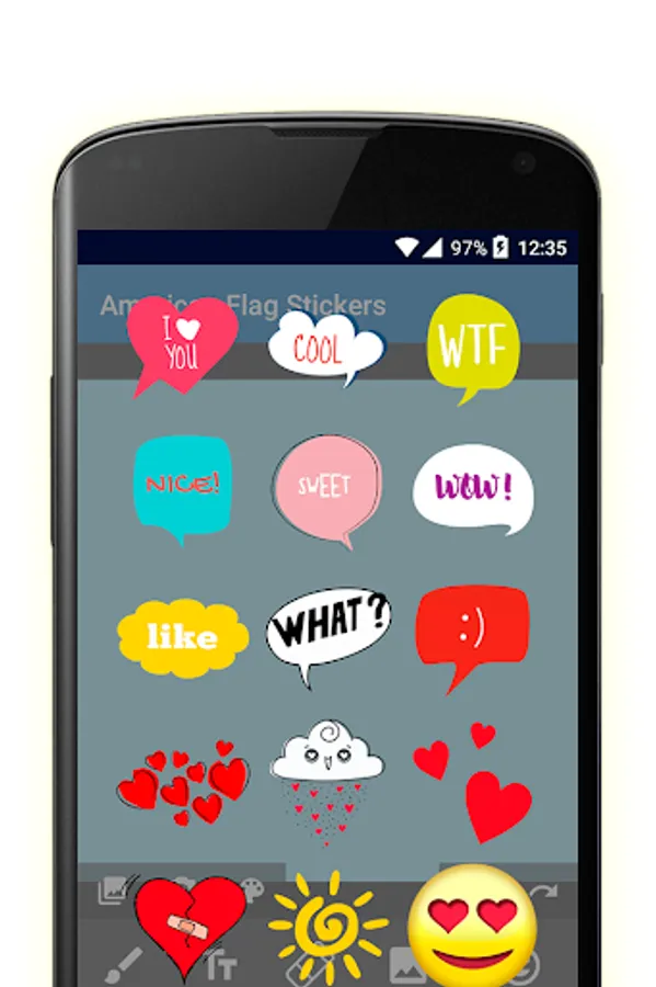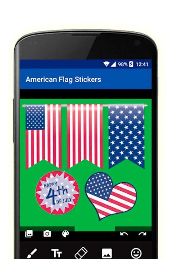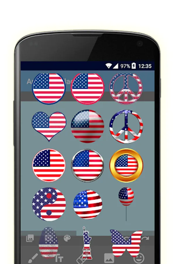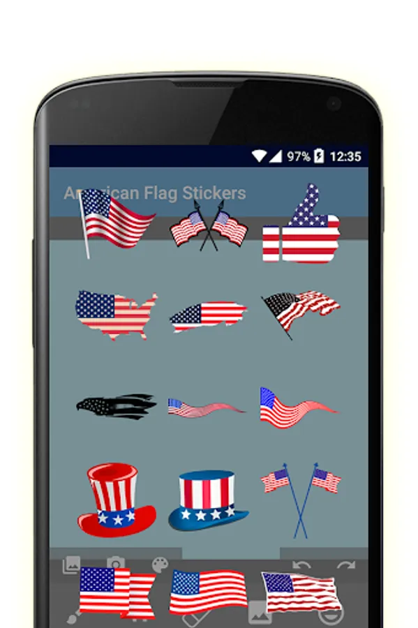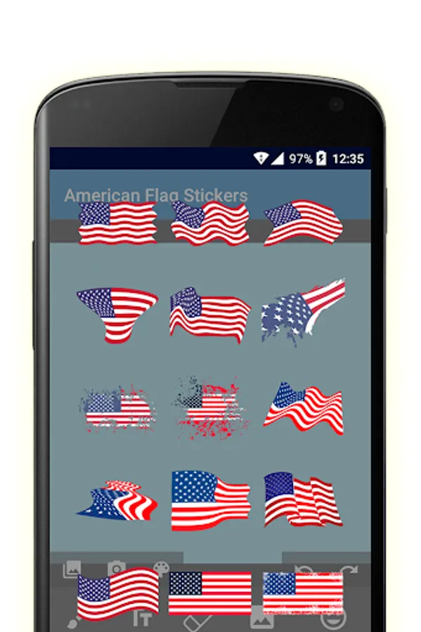 American flag stickers is much more than simple stickers. He is a photo editor and card maker, with 2 packages of stickers and several text styles.