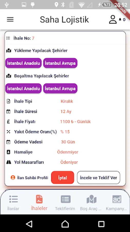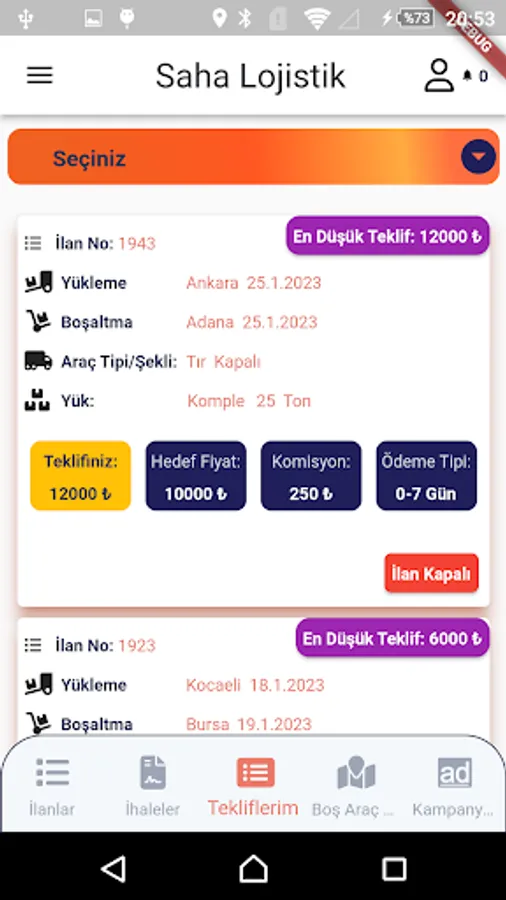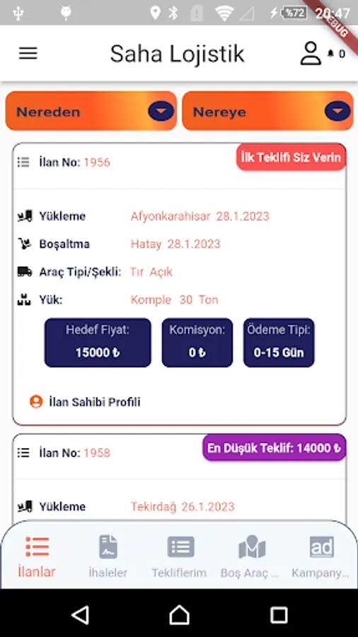 The meeting point of cargo owners and vehicle owners. You can enter your cargo ads and see the offers coming to your ads. You can see the quality of doing business from the profiles of the bidders. By accepting the offer you find suitable, you can find the appropriate vehicle for the transportation of your cargo. As a vehicle owner, you can search for cargo regardless of location and time.