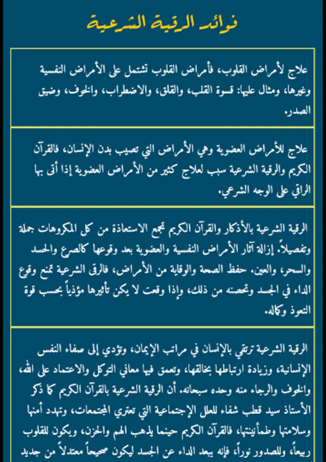 The legal ruqyah is the protection of the human soul from the eye, envy, and touch. Also, its content includes the request for healing and immunization from God Almighty, and the payment of evil and evil.