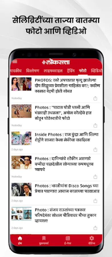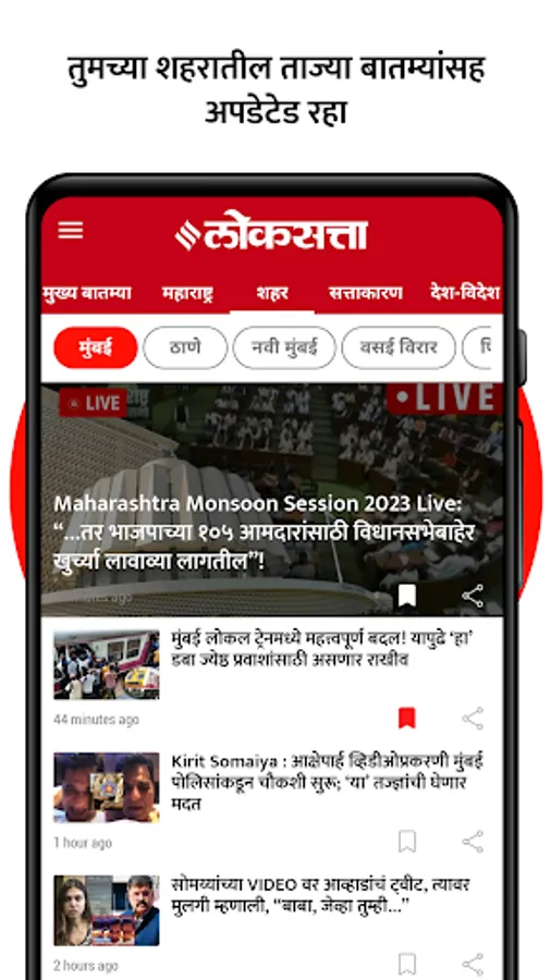 रोजच्या रोज ताज्या बातम्या आणि ई-पेपरच्या माध्यमातून इतरांपेक्षा पुढे राहा. स्थानिक पातळीपासून ते जागतिक स्तरावरील घडामोडी, ब्रेकिंग न्यूज ते सखोल वार्तांकन, तुम्हाला सर्व काही एकाच ठिकाणी मिळेल. महाराष्ट्रातील बातम्या, राजकारण, निवडणुका, क्रीडा, मनोरंजन, अर्थ, जोतिष, महिलावर्ग, गणेशोत्सव, क्रिकेटच्या स्पर्धा, पर्सनल फायनान्स, यूपीएससी आणि एमपीएससी आणि अशा विविध प्रकारच्या कंटेण्टचा आस्वाद घ्या.